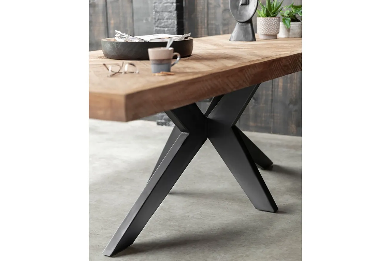 Getragen wird diese beeindruckende Tischplatte von einem Mittelfuß aus schwarzem Metall, der nicht nur für Stabilität sorgt, sondern auch einen modernen Akzent setzt. Die Kombination aus warmem Teakholz und kühlem Metall schafft eine faszinierende Harmonie und verleiht Ihrem Raum eine zeitgemäße Note.