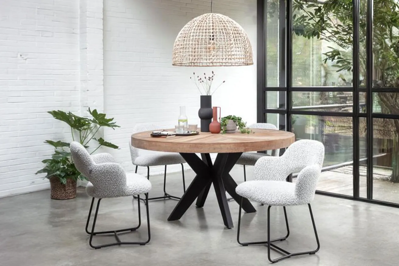 Willkommen an Ihrem neuen Mittelpunkt für gesellige Mahlzeiten und inspirierende Gespräche! Unser runder Esstisch vereint meisterhaft natürliche Schönheit und zeitlose Eleganz. Die Massivholzplatte aus recyceltem Teakholz in Fischgrätoptik erzählt Geschichten vergangener Leben und verleiht Ihrem Raum eine warme, authentische Atmosphäre.