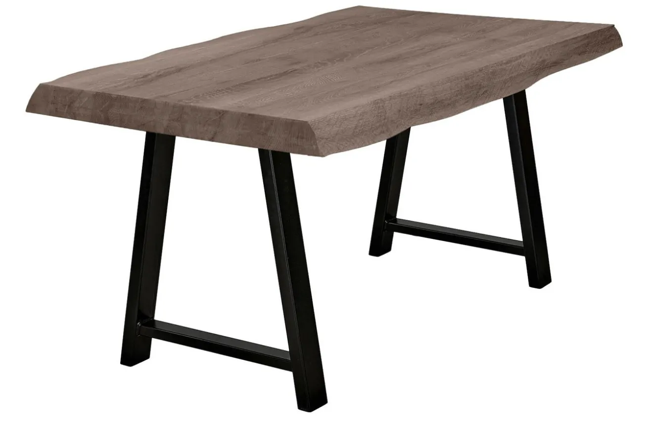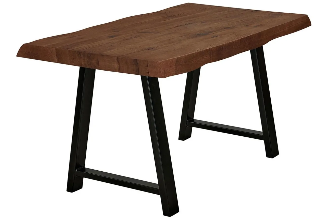 Die Platte aus massivem Eichenholz ist mit einer hochwertigen Lackierung versehen, die nicht nur die natürliche Schönheit des Holzes betont, sondern auch für eine strapazierfähige Oberfläche sorgt. Die Baumkante entlang der Tischplatte verleiht dem Tisch einen rustikalen Charme und unterstreicht seine natürliche Herkunft.