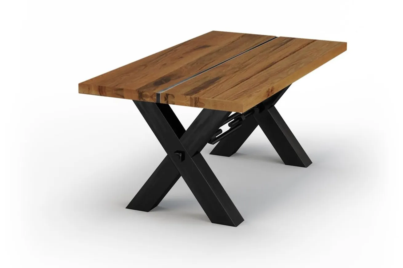Die beiden schwarzen Metallfüße in X-Form sind nicht nur ästhetisch ansprechend, sondern auch äußerst stabil. Sie tragen die Tischplatte mühelos und verleihen dem Tisch einen modernen Touch. Diese X-förmigen Füße sind nicht nur ein Gestaltungselement, sondern auch ein Symbol für die Verbindung von Tradition und Innovation.