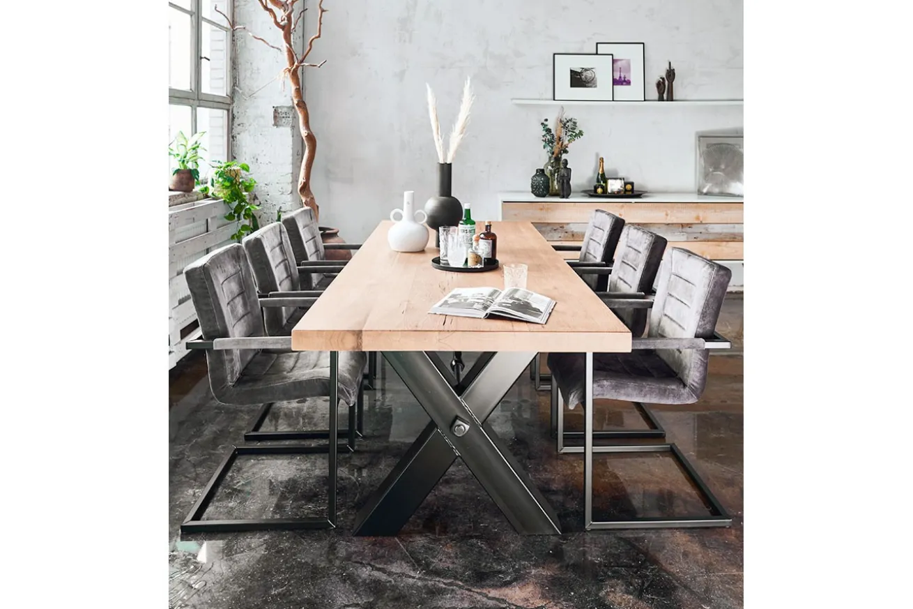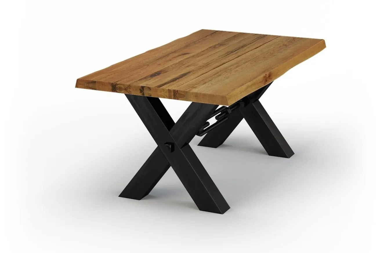 Unser Esstisch aus rustikalem Eichenholz mit natürlicher Baumkante und X-förmigen Metallfüßen ist die perfekte Wahl, um Familie und Freunde zu versammeln und gemeinsam unvergessliche Mahlzeiten zu genießen. Dieser Tisch wird Ihr Esszimmer in ein Zentrum der Bewunderung verwandeln.