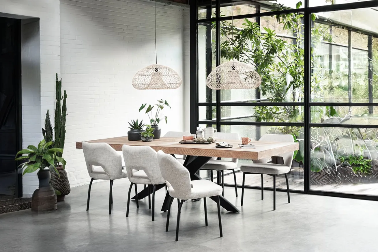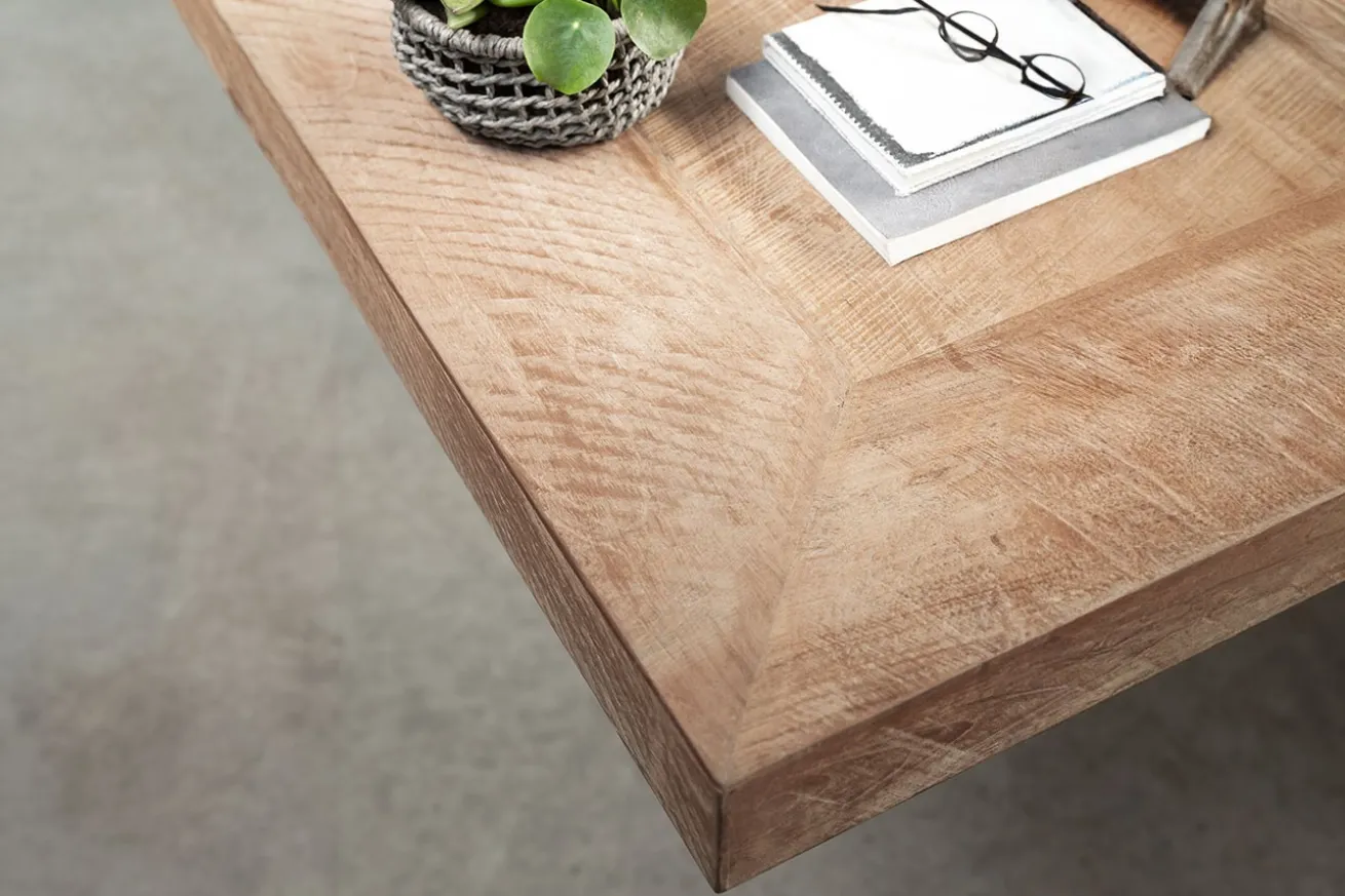 Tauchen Sie ein in die Naturschönheit und moderne Eleganz mit unserem rechteckigen Esstisch, der mit einer beeindruckenden Teakholztischplatte aus einzelnen Bohlen gefertigt ist. Jedes Stück erzählt seine eigene Geschichte und verleiht Ihrem Essbereich einen einzigartigen Charakter.