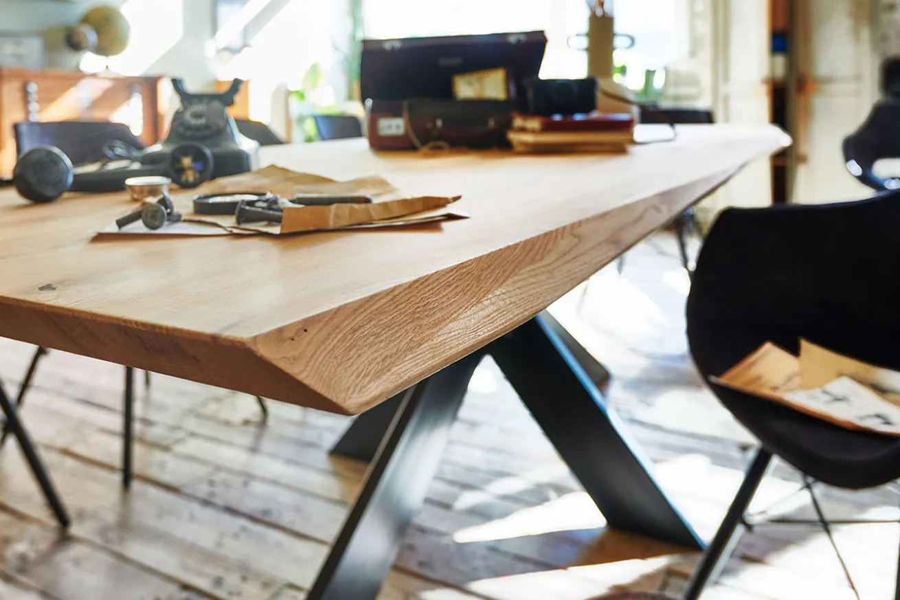 Nicht nur Arbeitende dürfen ins Home Office, auch Studenten müssen sich nicht unbedingt in die Bibliothek schleppen, sondern können gemütlich von zuhause aus arbeiten. So eine Hausarbeit muss mit äußerster Sorgfalt geschrieben werden. Und auch wenn es an diesem Ort genauso still ist, der Weg zum Kühlschrank und damit zum Essen kürzer. Madison, der Küchentisch aus rustikaler Eiche und lackierter Oberfläche und einem mittleren Stahlfuß in Schwarz bietet dank seiner ausgiebigen Maße ausreichend Platz für Co-Working an. Sei es, um zusammen für die Uni zu lernen oder aber doch um produktiv zu arbeiten.