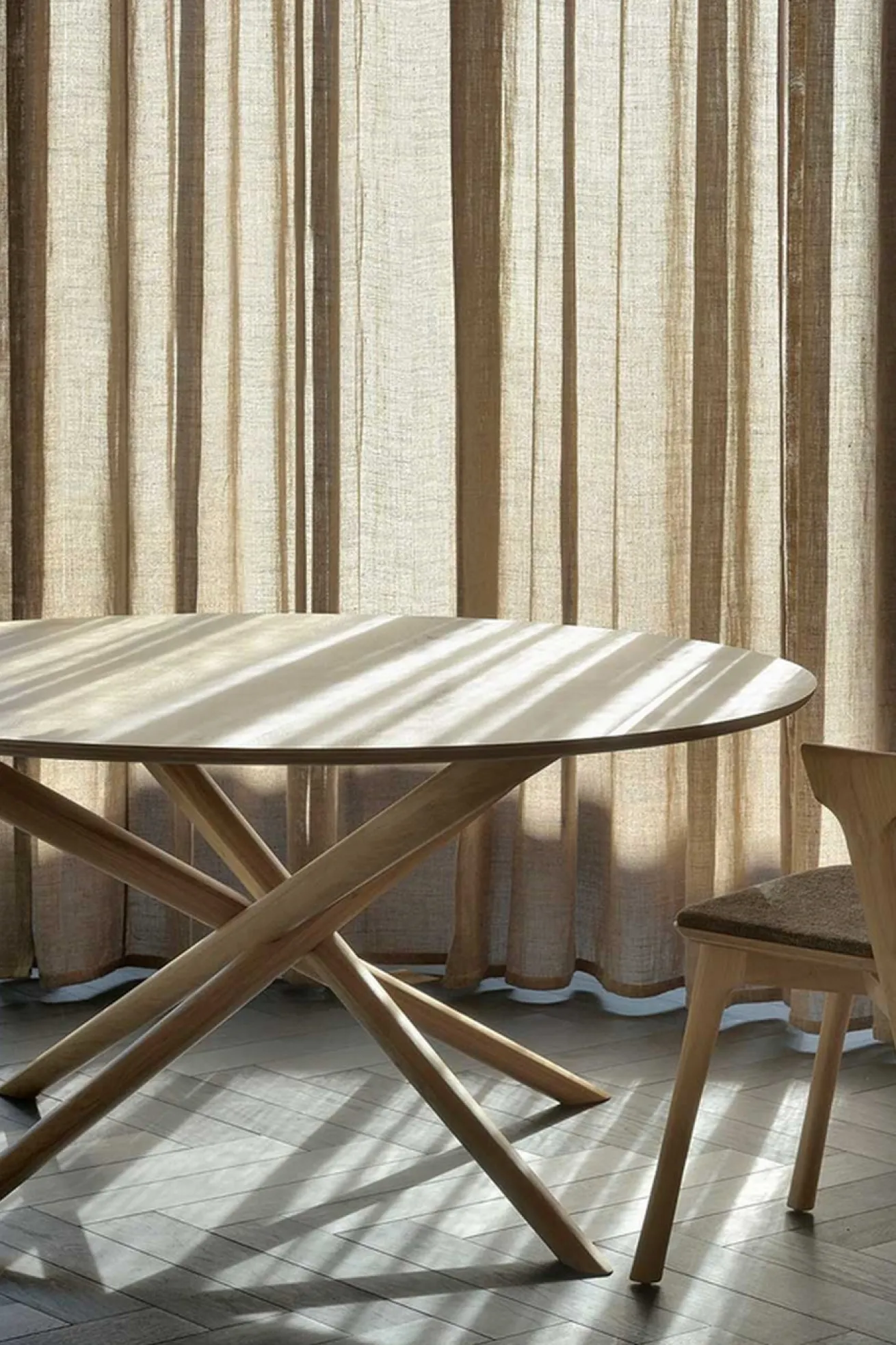 Der Mikado Esstisch, entworfen von Alain van Havre, ist seit Jahren eines unserer bekanntesten Designs. Sein skulpturaler Charakter ist das Ergebnis der Suche nach einem Gleichgewicht zwischen Funktionalität und Stabilität. Der Tisch besteht komplett aus Eiche. Die runde Tischplatte hat einen Durchmesser von 150cm, ihre Oberfläche wurde geölt, aber sie kommt trotzdem in ihrer Naturfarbe daher, die Rustikalität ausstrahlt und somit den gesamten Tisch in den Landhausstil passen lässt. Der Massivholztisch eignet sich also perfekt für große Esszimmer. Getragen wird die Platte von runden Holzbeinen, die sich wie Mikado-Stäbe verzahnt haben. Dadurch erhält das Massivholzmöbel einen ungewöhnlichen Look, der dem Produkt ein optisches Highlight verleiht. Durch den Austausch der rechteckigen Tischplatte durch eine runde erhöhen wir das Miteinander und die Verbindung. Es ist einfacher, mit Ihren Gästen zu interagieren, ermöglicht es Ihnen, mit jedem zu sprechen und bietet für über ein Dutzend Personen Bequemlichkeit. Wir haben es ausprobiert.