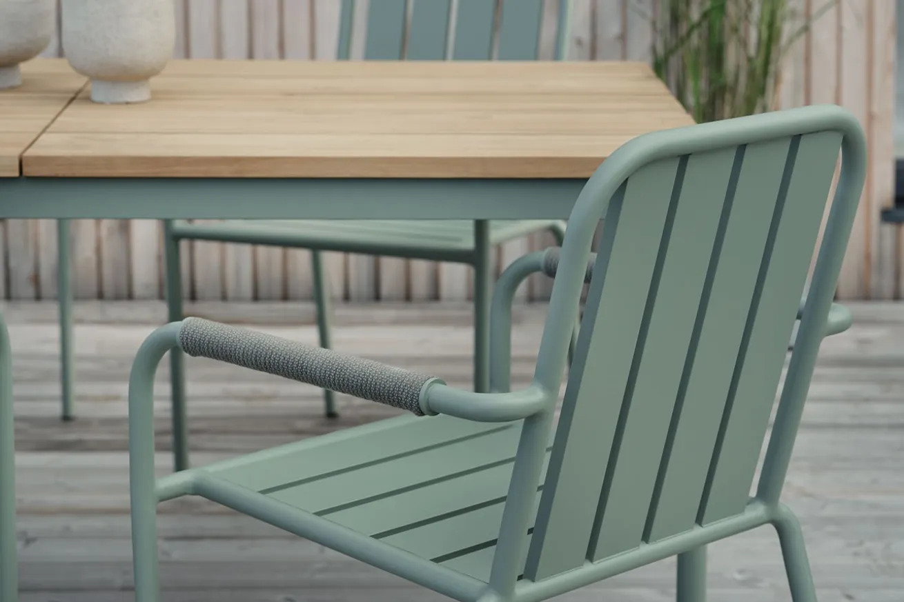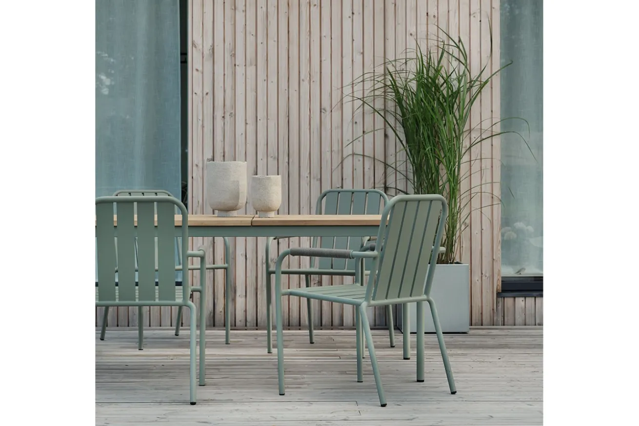 Kreieren Sie mit Nox einen charmanten Terrassenbereich im modernen Stil. Mit seiner Platte aus Teakholzlamellen und seinem Gestell aus grün pulverbeschichtetem Aluminium harmoniert er perfekt mit der Natur, die ihn umgibt und passt sich so hervorragend seiner Umgebung an. Mit einer Breite von 238cm gleicht der Tisch einer Tafel und bietet ausreichend Platz für die gesamte Familie.