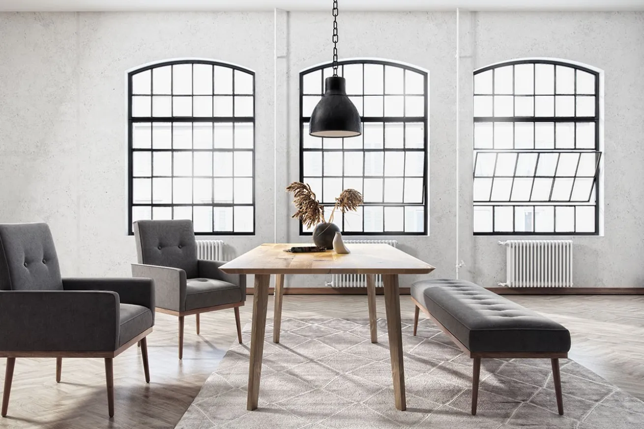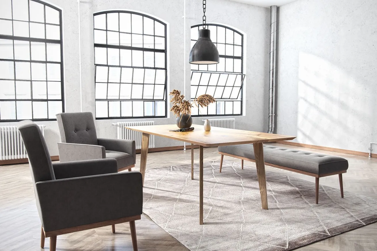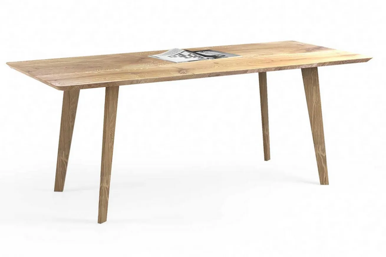 Ein schlichter und moderner Tisch, wie in jeder gern hat. Unser Modell hat die Maße Breite 200cm, Tiefe 100cm und Höhe 75cm. Durch seine Maße gleicht der Esstisch eher einer Tafel, an der viele Gäste Platz nehmen können. Er besteht aus Eichenholz und ist naturfarben. Das sehr begehrte Möbelholz sieht auch hier als Tisch rustikal und schön aus, was für das Holz ebenfalls typisch ist. Getragen wird die Platte, die eine Stärke von circa drei Zentimetern hat, von vier Füßen, die ebenfalls aus dem Massivholz Eiche sind. Da die Oberfläche und der ganze Tisch an sich unbehandelt ist, erstrahlt das Produkt in seiner natürlich-warmen Farbe gelbbraun mit gut erkennbaren Jahresringen.