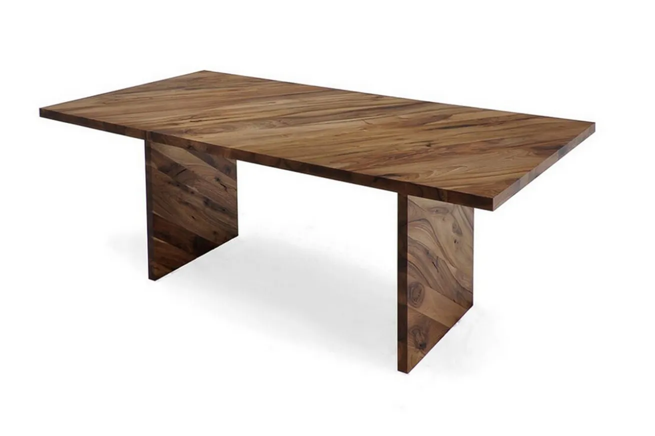 Welch ein Augenschmauß dieser wunderschöne Esstisch aus wildem Nussholz, finden Sie nicht auch? Mit den Maßen breite 160cm, Tiefe 90cm und Höhe 76cm ist er nicht nur groß genug für mindestens 6 Personen, sondern hat auch genügend Fläche für Dekoration wie Kerzen und Tabletts mit Obst oder Blumenvasen. Unser Holztisch kommt in seiner natürlichen, dunklen Farbe daher. Die Oberfläche ist unbehandelt. Typisch für diese Holzart ist die ausdrucksstarke Maserung, wie Sie auch hier sehen können. Bei genauer Betrachtung entdecken Sie, dass Platte und Beine aus einzelnen Holzbohlen gefertigt wurden, die zusammengepresst jene tragenden und zu tragenden Teile ergeben, wodurch eine noch besonderere Maserung entsteht. Der Massivholztisch hat eine gerade Kante. Diese unterstreicht die Beständigkeit des Holzes. Das Massivholzmöbel lässt sich mit verschiedenen Farben dekorieren, um Kontraste zu setzen und den Tisch als Blickfang in Ihrem Esszimmer zu machen.