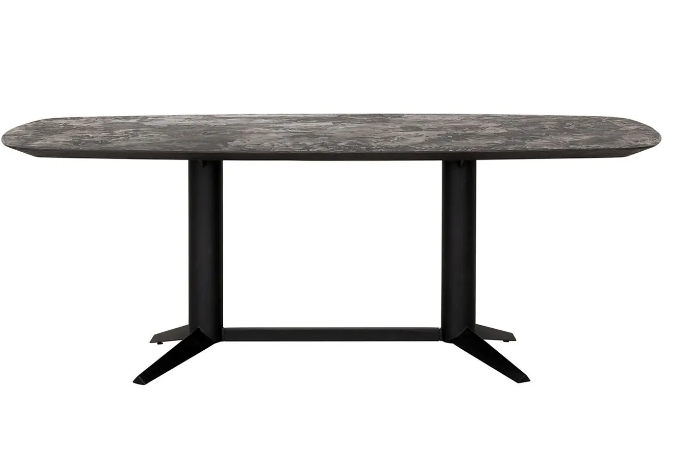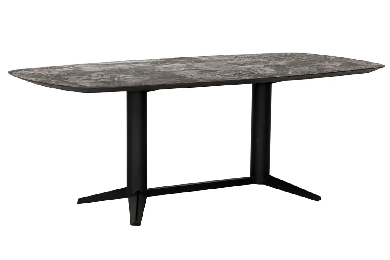 Getragen wird die Tischplatte von einem eleganten, 2-füßigen Mittelgestell aus schwarzem Metall, das nicht nur für Stabilität sorgt, sondern auch einen markanten industriellen Akzent setzt. Die klare Linienführung und das minimalistische Design des Gestells harmonieren perfekt mit der modernen Eleganz der Tischplatte.