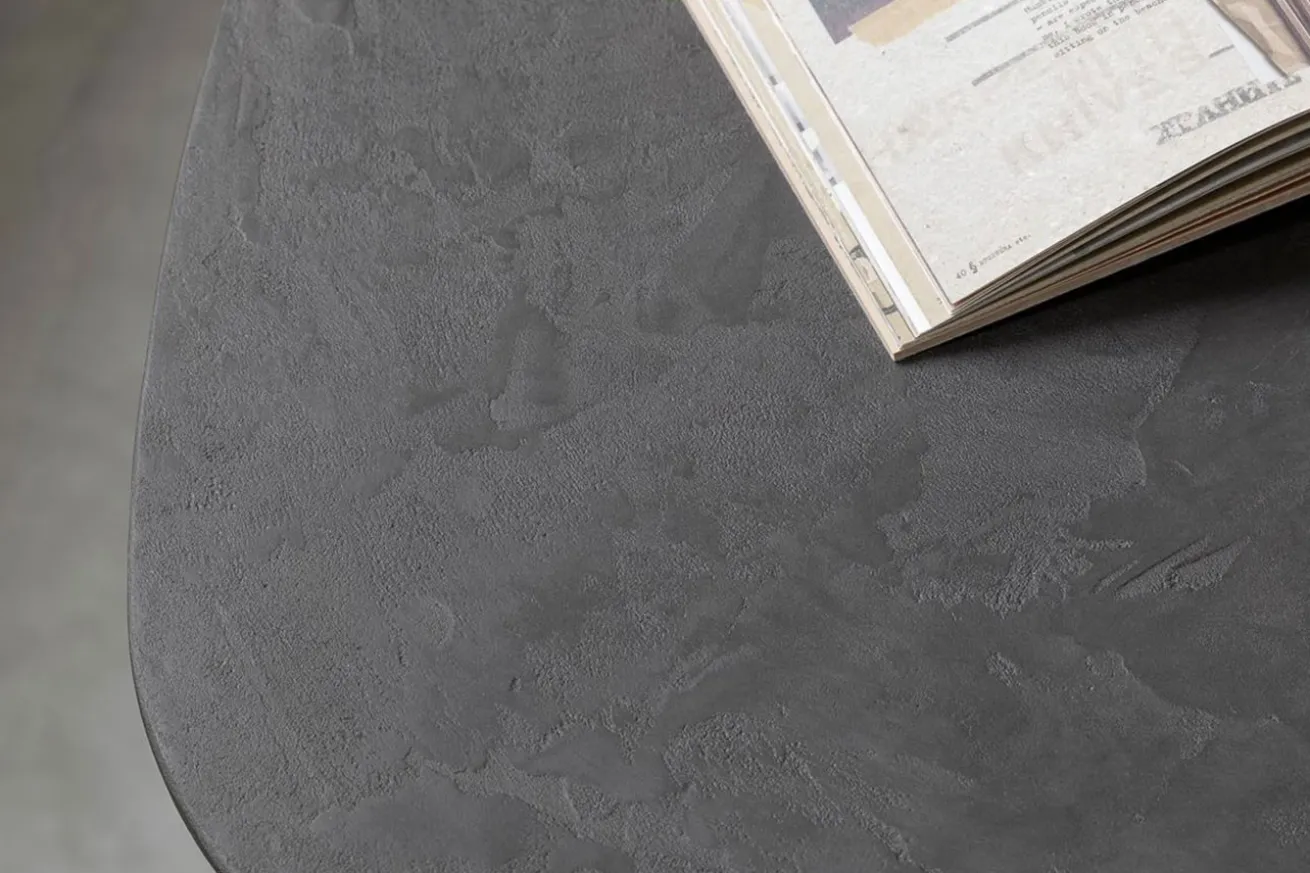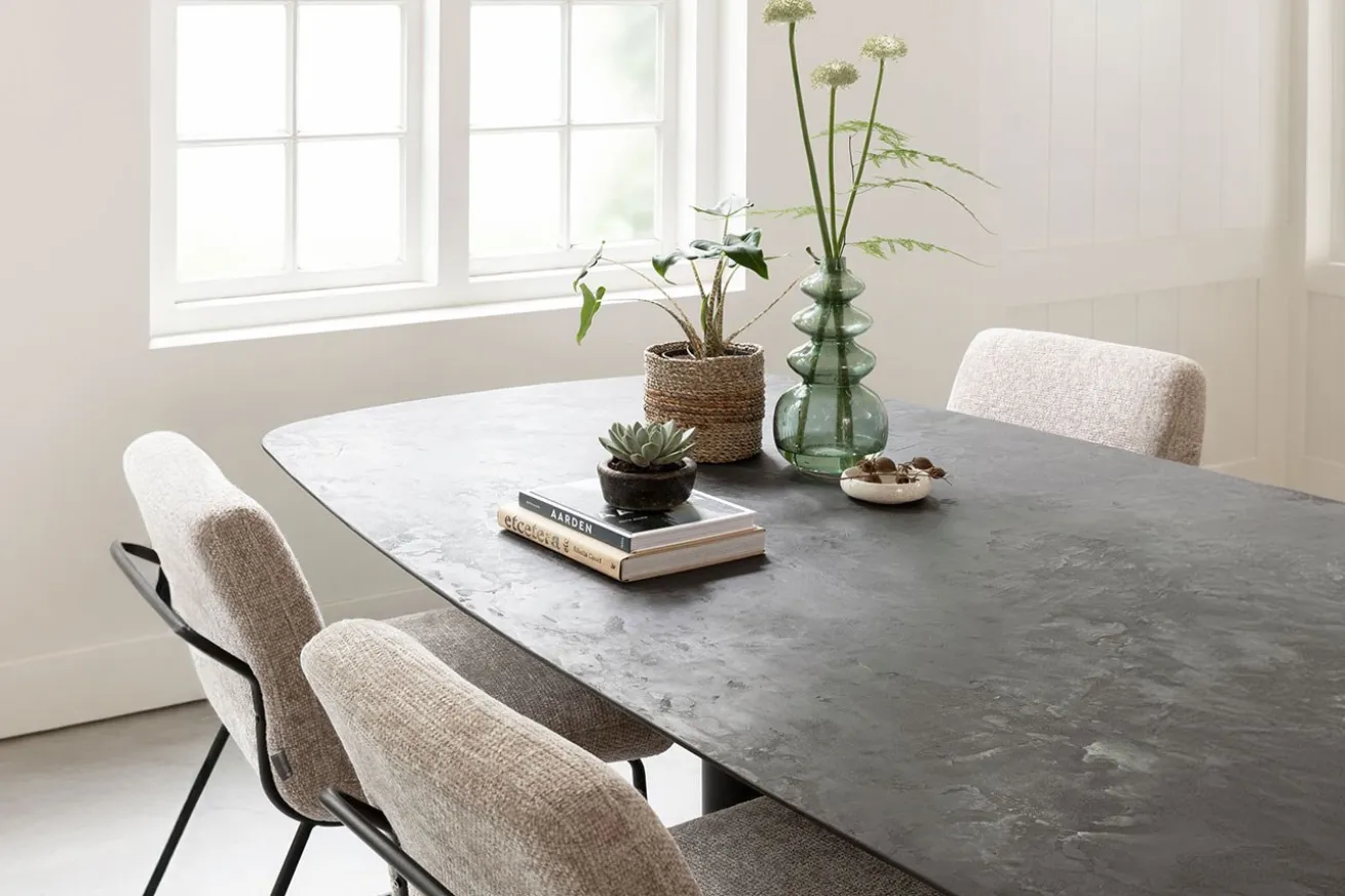 Getragen wird die Arbeitsplatte von einem stabilen, 2-füßigen Mittelgestell aus schwarzem Metall. Das minimalistische Design des Gestells harmoniert perfekt mit der modernen Ästhetik des Tisches und sorgt für Stabilität und Langlebigkeit. Bringen Sie mit unserem Esstisch im Industrial Look aus schwarzem Mortex und Metallgestell zeitlose Eleganz und modernen Chic in Ihr Zuhause und schaffen Sie einen Essbereich, der zum Genießen und Verweilen einlädt.