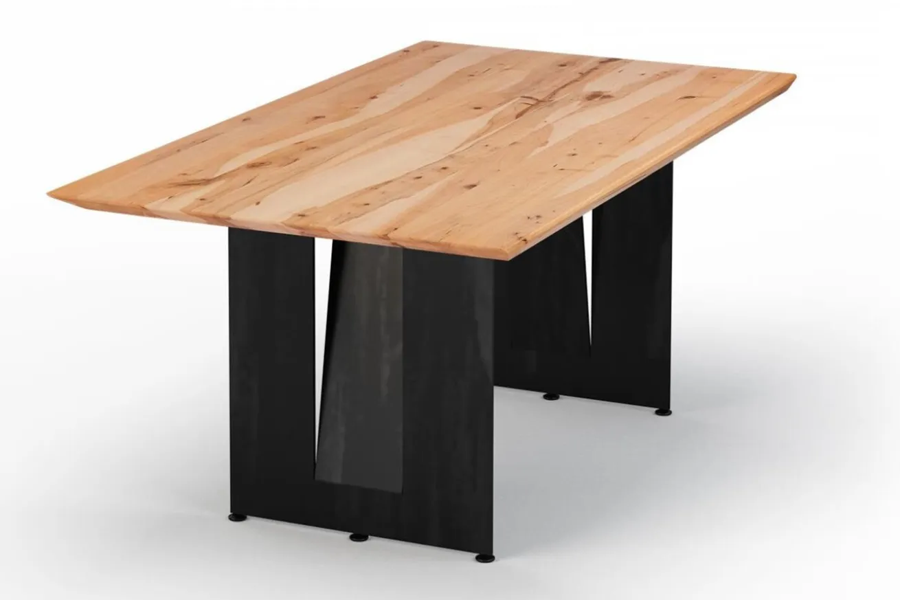 Die zwei U-förmigen Metallfüße in elegantem Schwarz bilden einen faszinierenden Kontrast zur natürlichen Schönheit des Ahornholzes und verleihen dem Esstisch eine moderne Ästhetik. Die klaren Linien und die stabile Konstruktion der Füße sorgen für eine solide und zuverlässige Basis, auf der Sie sich jederzeit verlassen können. So können Sie den Esstisch nicht nur als stilvolle Essgelegenheit nutzen, sondern auch als beeindruckendes Designelement in Ihrem Wohnraum.