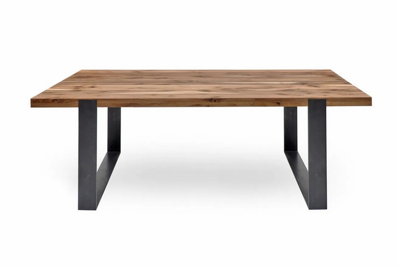 Dieser Massivholz Esstisch aus europäischen Wildnussbaum ist besonders geprägt durch seine naturbelassenen Merkmale wie Astlöcher oder Risse. Die Oberfläche der Tischplatte ist sandgestrahlt und lackiert.