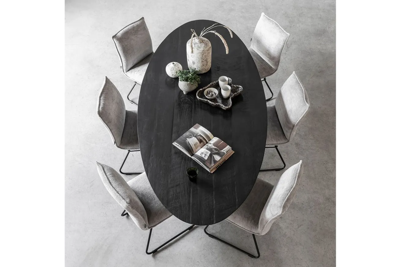 Tauchen Sie ein in die Welt des anspruchsvollen Designs und der nachhaltigen Eleganz mit unserem bemerkenswerten ovalen Esstisch. Dieser Esstisch vereint die Schönheit von recyceltem, schwarzem Teakholz und modernem Stil auf faszinierende Weise. Er wird nicht nur zum Mittelpunkt Ihrer Mahlzeiten, sondern auch zur Aussage über Ihr Verständnis von Ästhetik und Umweltbewusstsein.