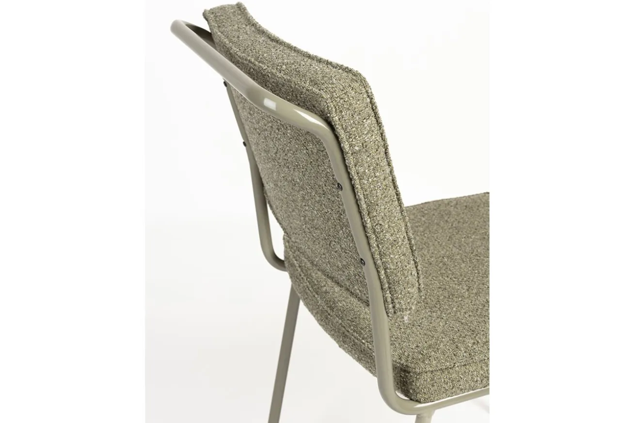 Was ihn besonders macht? Die gebogene Metallrückenlehne ist mehr als nur ein Design-Element – sie dient gleichzeitig als praktischer Griff. So lässt sich der Stuhl easy verrücken, ganz ohne Spuren am Stoff oder Herumgeschiebe.