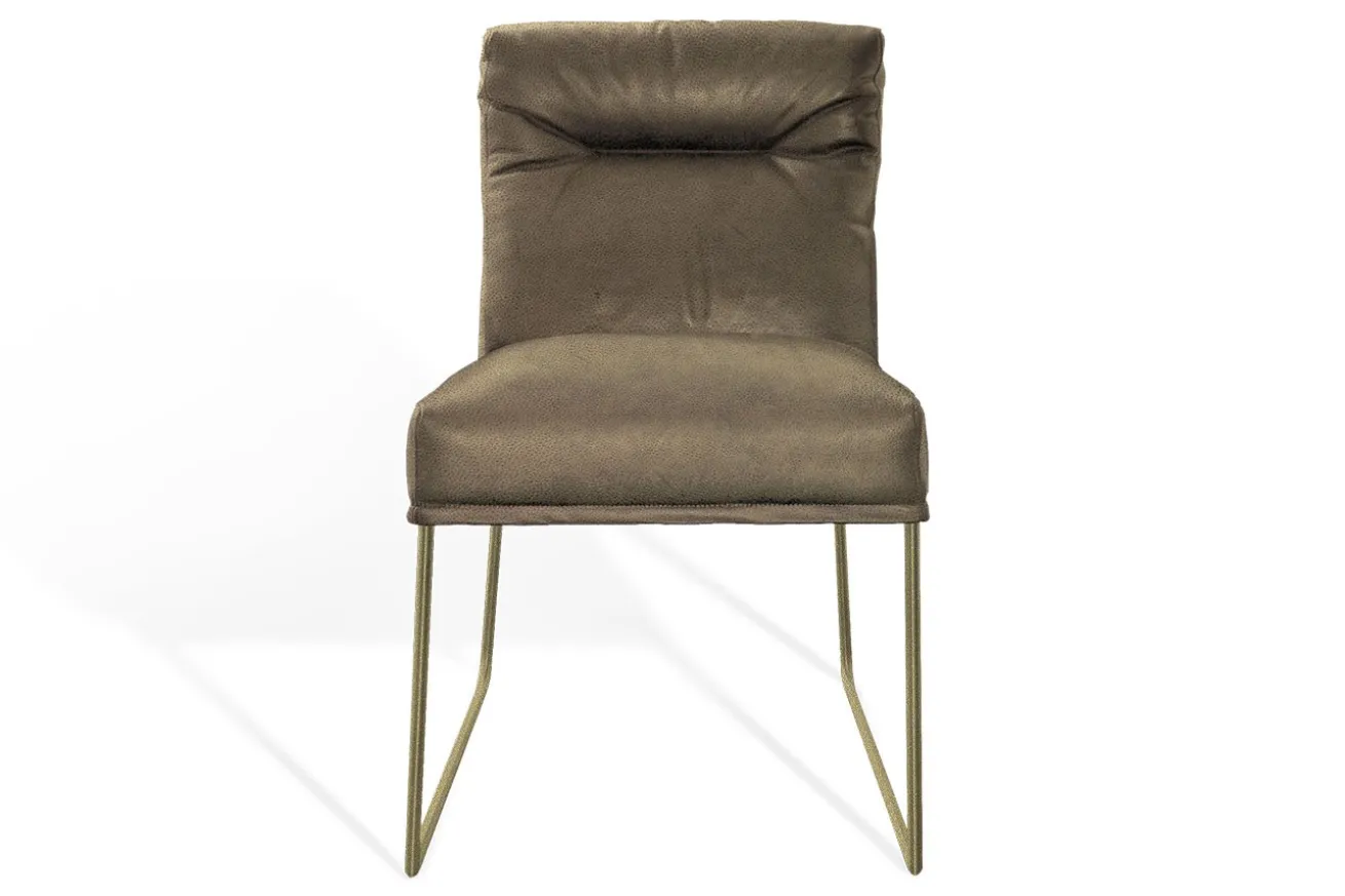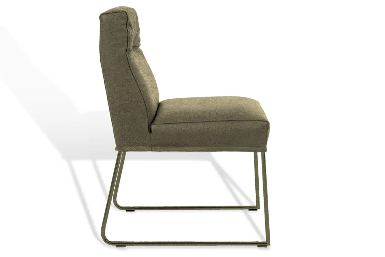 Ohne Armlehnen bietet dieser Stuhl maximale Bewegungsfreiheit und Flexibilität. Das minimalistische Design bringt Leichtigkeit in Ihr Interieur und passt perfekt zu verschiedenen Einrichtungsstilen. Die stilvollen Kufensockel in einem warmen Olivton setzen einen modernen Akzent und verleihen dem Stuhl nicht nur Stabilität, sondern auch eine elegante Schwebeoptik. Diese innovative Fußgestaltung unterstreicht die moderne Formensprache des Möbels.