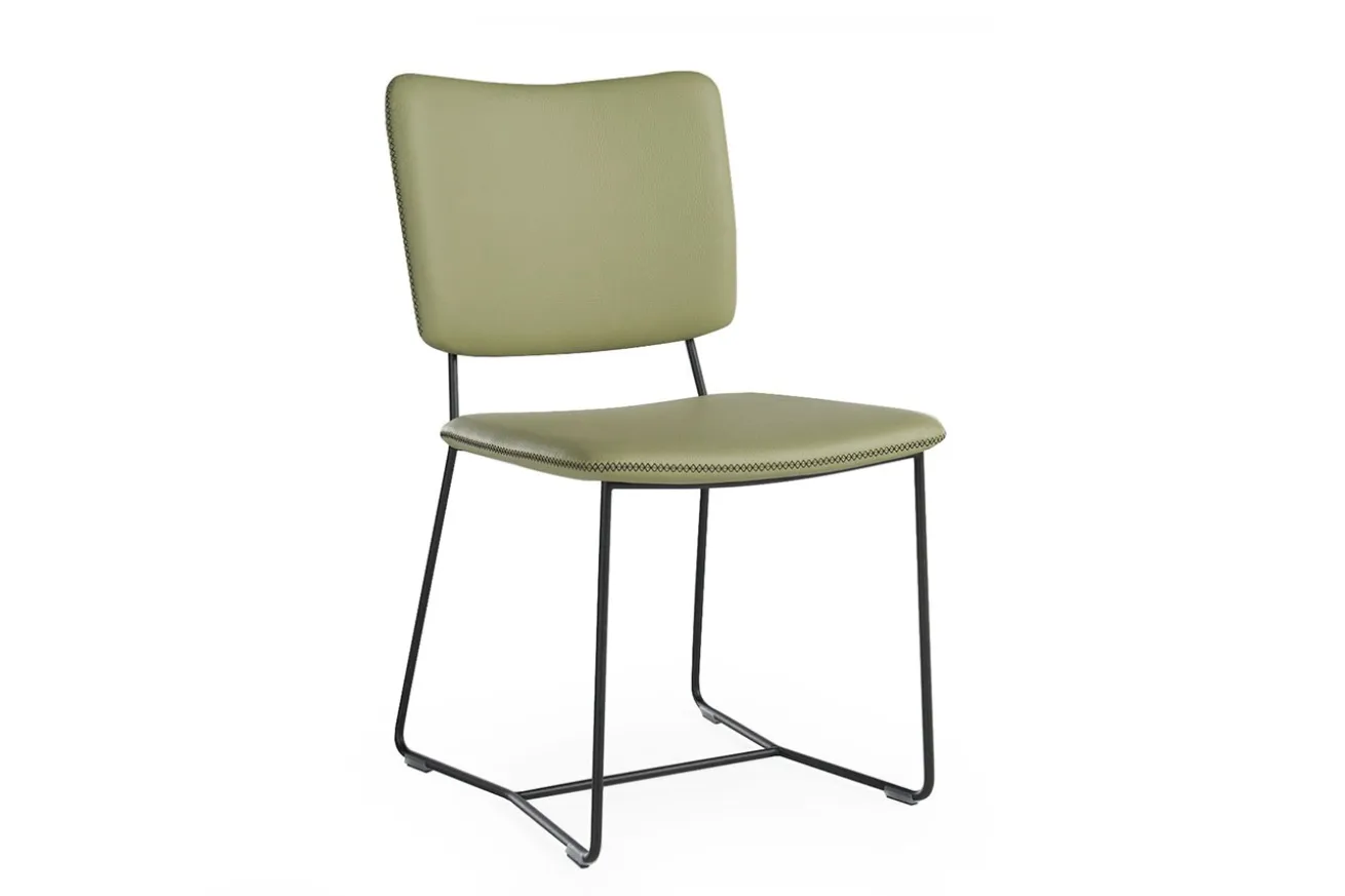 Das hier ist ein zierlicher Esszimmerstuhl ohne Armlehnen, der sich jederzeit auch in der Küche am Küchentisch einsetzen lässt. Kiko hat eine Breite von 48cm, eine Höhe von 89cm und eine Tiefe von 60cm. Lehne und Sitzfläche, die nicht durchgängig miteinander verbunden sind, bestehen aus pistaziengrünem Stoff. Sie werden von einem anthrazitfarbenem Metallgestell mit vier Füßen getragen. Durch diese besondere Farbgebung erhält der Stuhl eine außergewöhnlich schöne Retro-Optik. Egal, ob in Küche oder am Schreibtisch, der elegant aussehende Stuhl macht nicht nur optisch was her, sondern bereitet seinen Besitzern auf lange Zeit viel Freude.