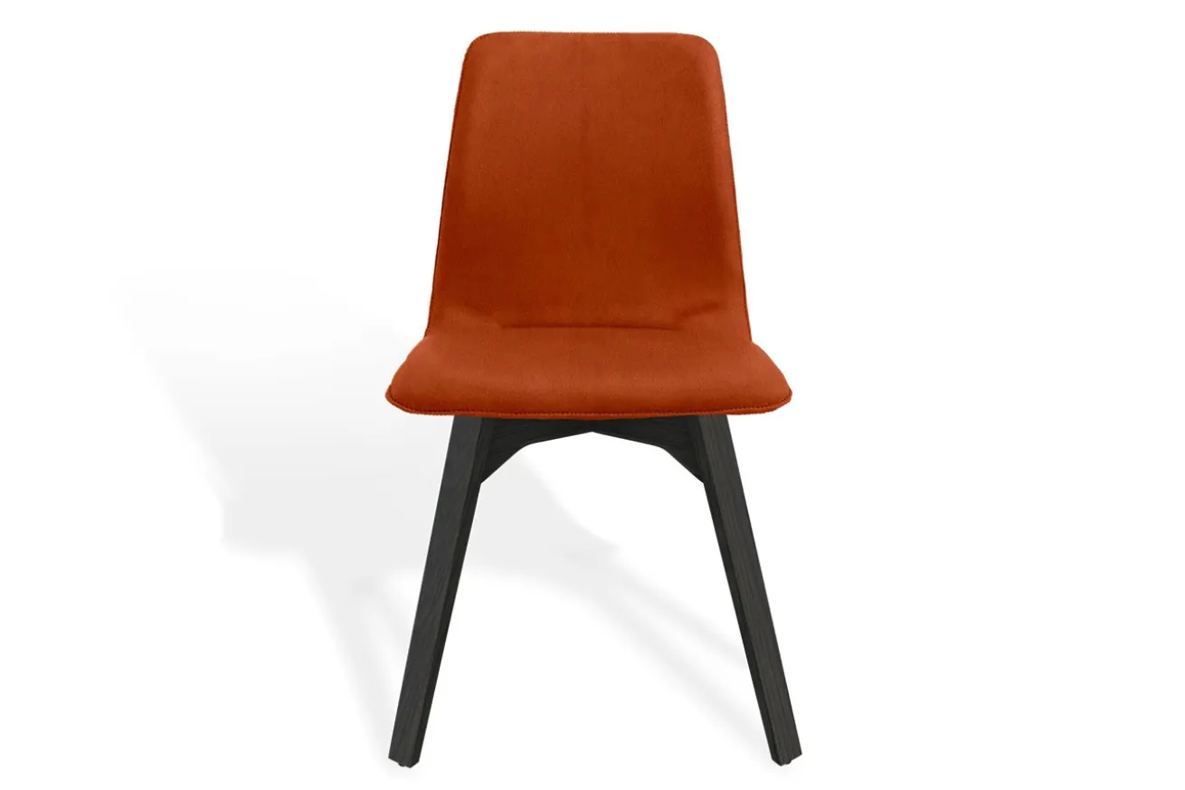 Das 4-füßige Gestell aus schwarz gebeiztem und lackiertem Eichenholz bietet nicht nur eine hervorragende Stabilität, sondern verleiht dem Stuhl auch eine elegante, zeitgemäße Ausstrahlung. Die klare, minimalistische Linienführung harmoniert perfekt mit der warmen, strahlenden Farbe des Stoffes und schafft einen ansprechenden Kontrast, der in jedem Essbereich zur Geltung kommt.