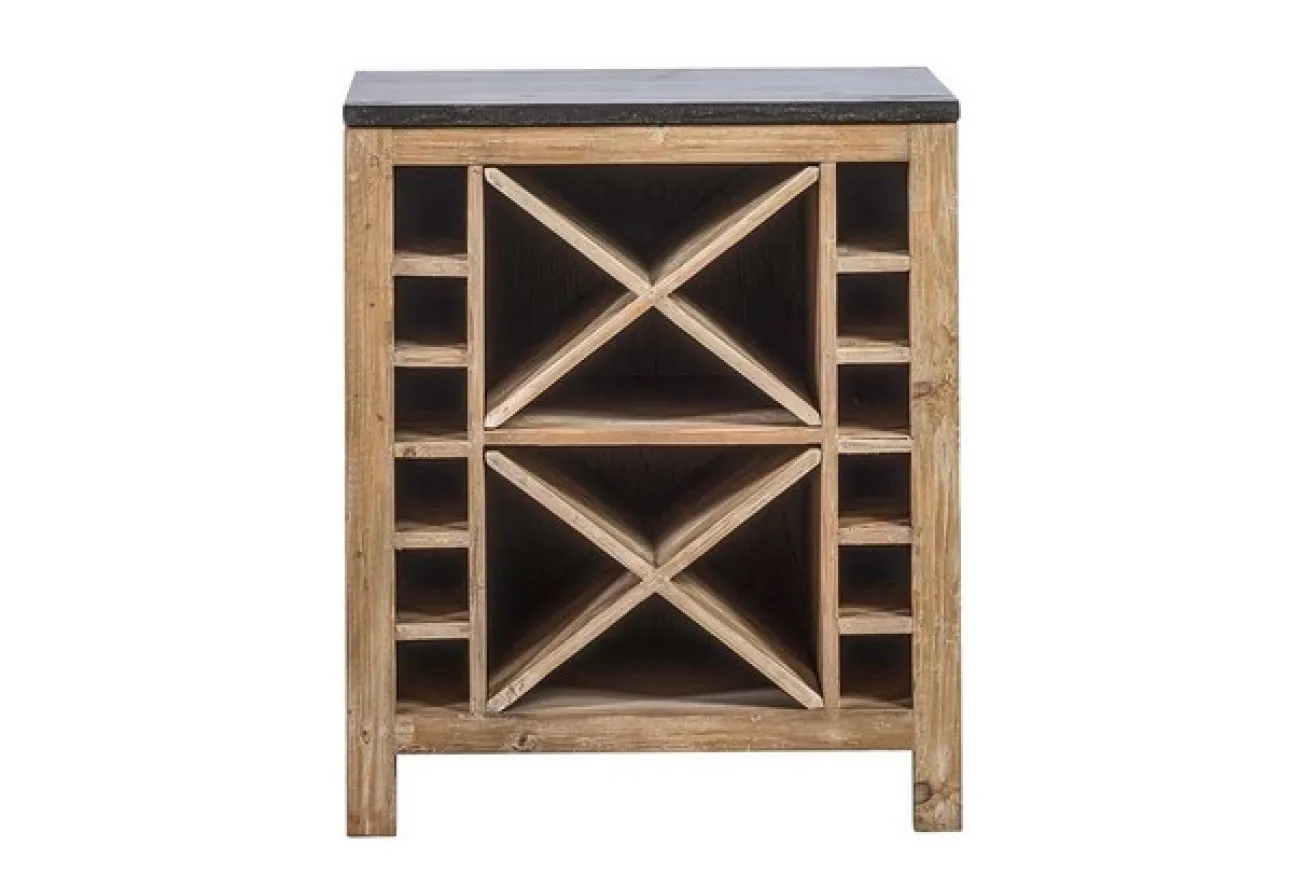 Holen Sie sich den Charme des Landhaus-Stils mit dem Luxus eines modernen Möbels auch auf die überdachte Terrasse. Der Flaschenschrank Montpellier aus leicht pigmentiertem recycletem Kiefernholz macht´s möglich. Eine schwere Steinplatte in dunklen schwarzgrauen Farbtönen sorgt für Aufsehen. In dem unteren Teil ist dieses Küchenmöbel mit grossen und kleinen Fächern für Flaschen ausgestattet. (nicht Winterfest, im Aussenbereich wird das Holz stärker Arbeiten, als im Innenbereich. Es können Spannungsrisse auftreten. Schubladen und Türen sollten in regelmäßigen Abständen überprüft und eingestellt werden)