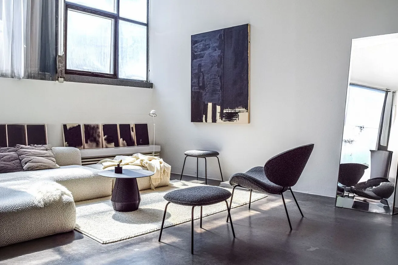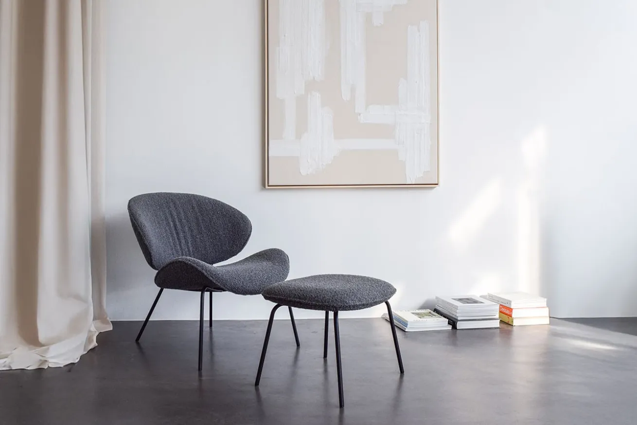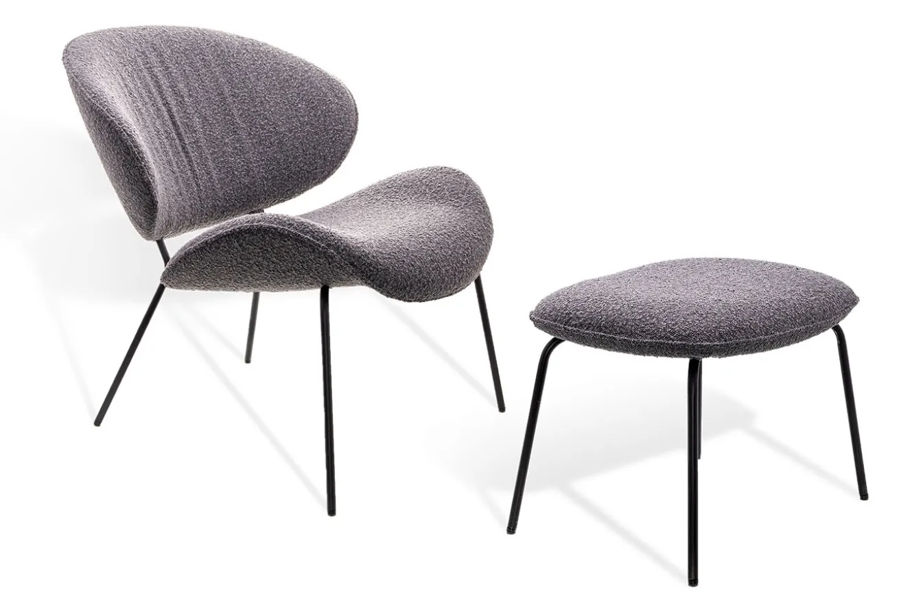 Der Fußhocker ist ebenfalls mit hochwertigem grauem Boucléstoff bezogen, der die gleiche weiche und einladende Textur wie der Sessel bietet. So entsteht ein harmonisches Gesamtbild, das sowohl modern als auch zeitlos ist. Der Boucléstoff lädt dazu ein, die Füße hochzulegen und sich zu entspannen, sei es bei einem gemütlichen Abend mit einem guten Buch oder beim Entspannen nach einem langen Tag.