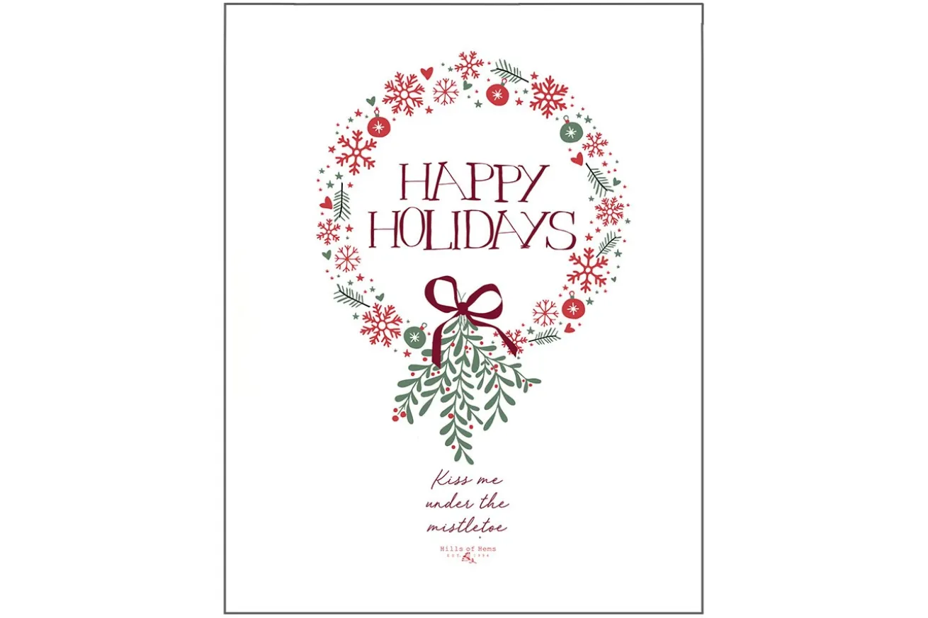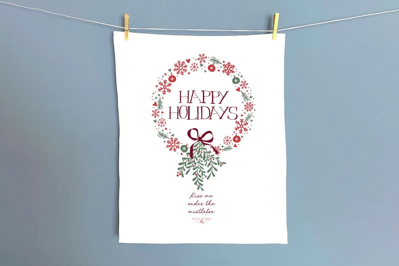 Auf der Suche nach den passenden Wohnaccessoires für die Weihnachtszeit? Dann haben wir genau das Richtige für Sie. ‚Frohe Weihnachten‘ lässt sich nicht nur mit einer Karte oder mit Worten sagen, sondern auch mit diesem handgefertigten Geschirrtuch aus Baumwolle. Auf diesem befindet sich ein Kranz aus grünen und roten Ornamenten, die man mit Weihnachten in Verbindung setzt: Tannenzweige, Christbaumkugeln, Schneeflocken und Sterne. Und am unteren Rand befindet sich ein Mistelzweig, unter dem man sich nach amerikanischen Brauch küsst. Wie passend, dass untendrunter, klammheimlich genau dieser Satz in Schreibschrift platziert wurde. Vielleicht wird dieser Wunsch wahr.
