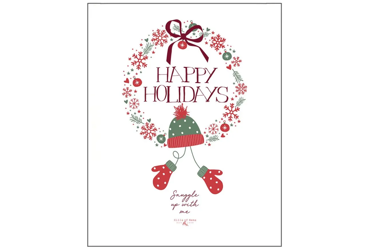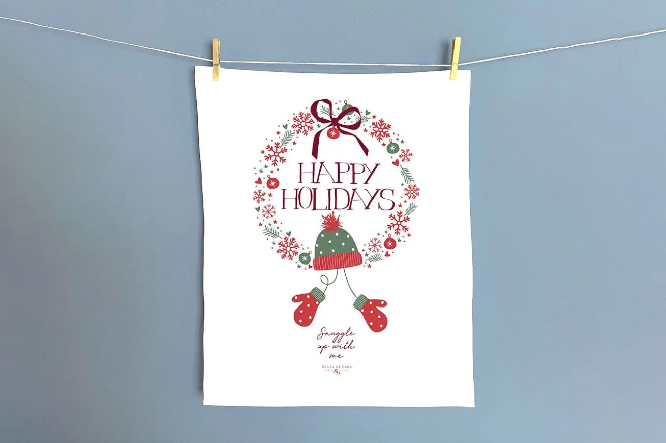 An Weihnachten wünschen wir uns alle Schnee und eisige Kälte. Auch wenn es in den letzten Jahren eher warm gewesen ist, geben wir die Hoffnung nicht auf. Mit dem passenden Geschirrtuch aus Baumwolle, das handgefertigt ist, manifestieren wir den Wunsch einfach. Auf diesem rot-grünen Kranz hängt am unteren Rand eine Mütze mit einem Handschuh Paar, das an lustige Schneetage erinnert. Auch dieses Set ist in den weihnachtlichen Farben designt. Im Kontrast dazu steht in roter Schreibschrift die Bitte, sich mit der Person im warmen Zuhause einzukuscheln und der Kälte keine Chance zu geben. Auch als Weihnachtsgeschenk eine schöne Idee!