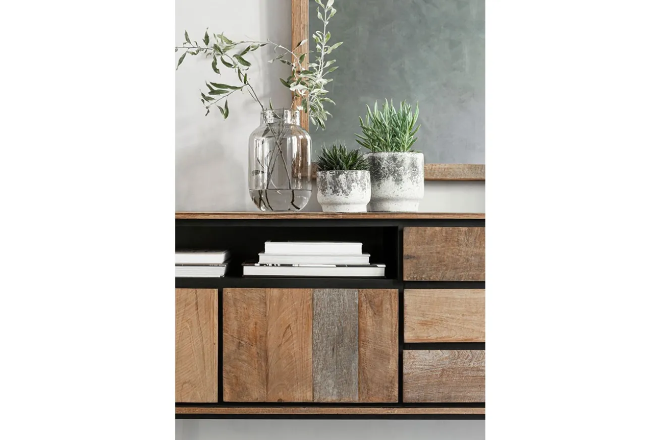 Mit ausreichend Stauraum und einer eleganten Präsenz eignet sich dieses Highboard perfekt für Ihr Wohnzimmer, Schlafzimmer oder Büro. Nutzen Sie es, um Ihre Lieblingsstücke auszustellen, Ihre Sammlungen zu organisieren oder Ihre persönlichen Gegenstände sicher aufzubewahren. Dieses Highboard verkörpert die Verbindung von Geschichte und Modernität, von Funktion und Design – ein Möbelstück, das nicht nur Ihr Zuhause, sondern auch Ihren Lebensstil bereichert. Mit einem Korpus aus recyceltem, unbehandeltem Teakholz und einem eleganten schwarzen Metallgestell vereint dieses Möbelstück Funktionalität und Ästhetik auf meisterhafte Weise.