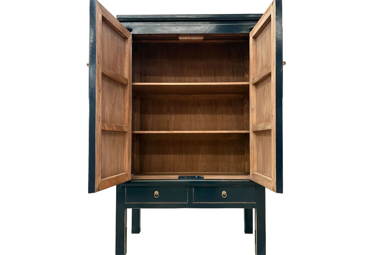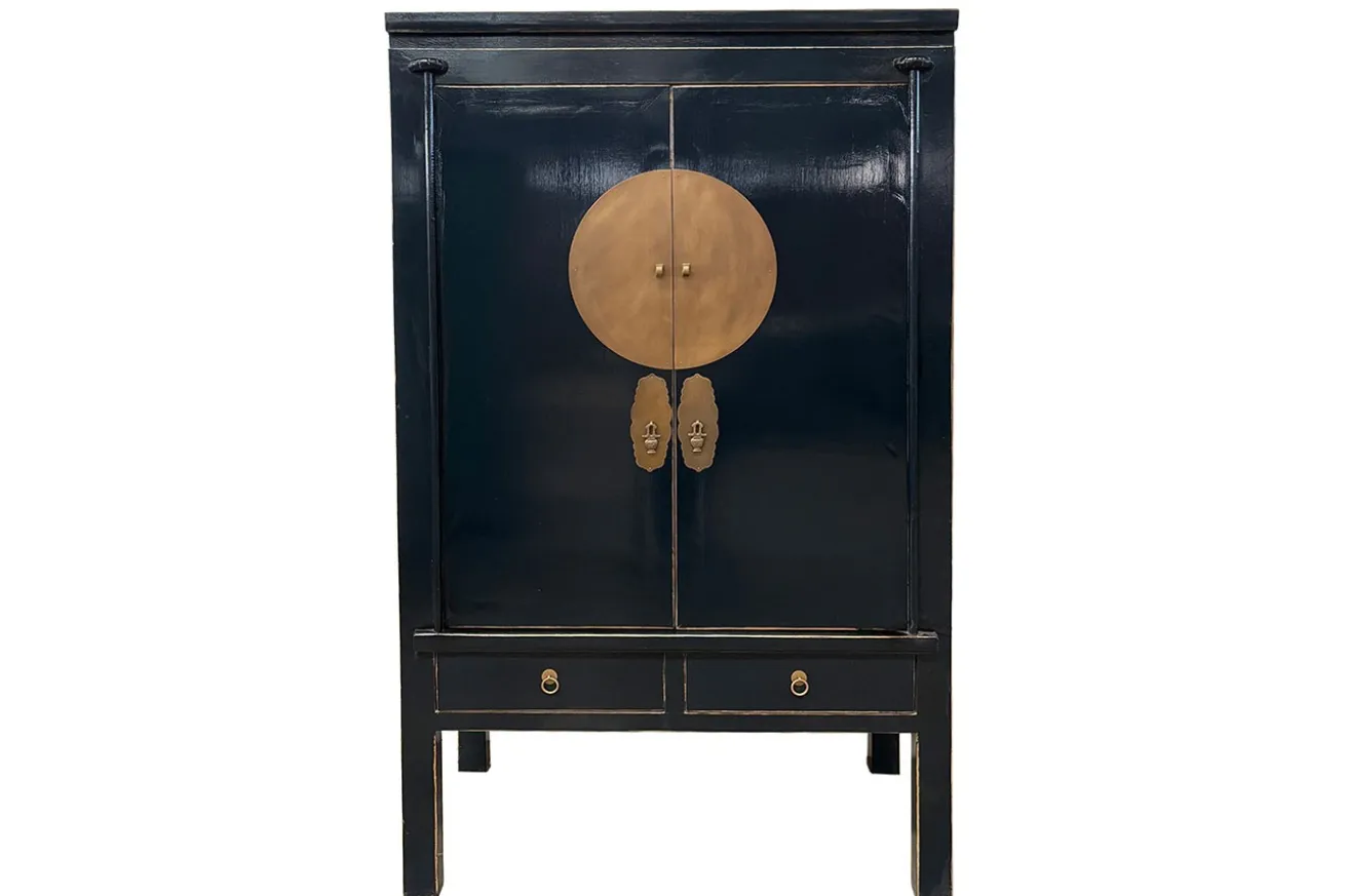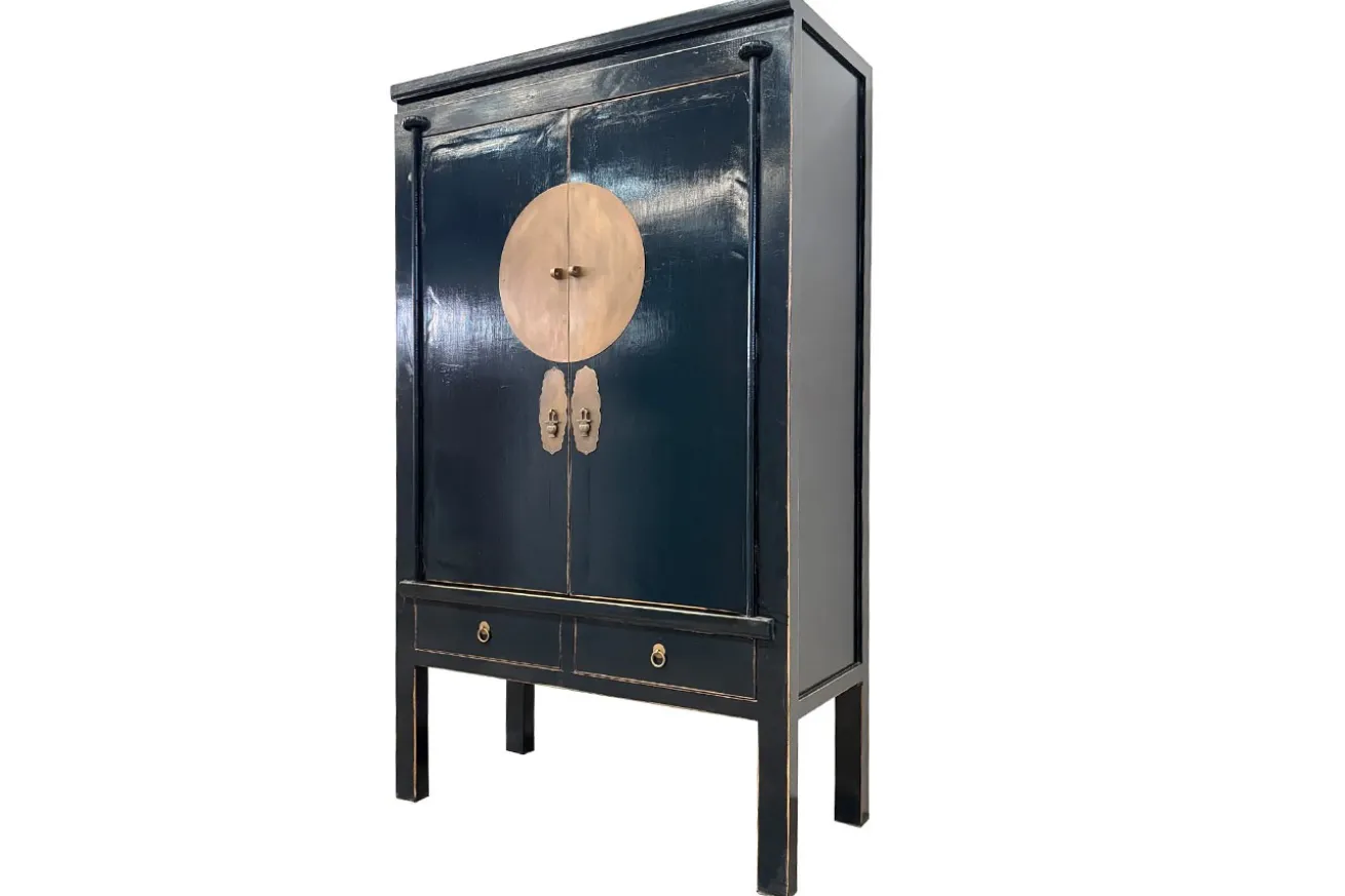 Dieser schlanke Kleiderschrank ist vom asiatischen Stil inspiriert und fügt sich mit seinem eleganten blauen Farbton perfekt in verschiedenste Einrichtungskonzepte ein. Das hochwertige Massivholz wurde in einem kräftigen Dunkelblau lackiert und mit goldfarbenen Akzenten versehen, wie den stilvollen Griffen und einem dekorativen Kreis darunter, die dem Möbelstück seinen unverwechselbaren Charakter verleihen. Dieser Schrank bietet reichlich Stauraum für unterschiedlichste Zwecke – sei es zur Aufbewahrung von Tassen, Snacks oder Kaffeebehältern. Die beiden geräumigen Fächer hinter den Türen bieten Platz für Tischdecken, Platzsets oder dekorative Teelichthalter, während die zwei Schubladen im unteren Bereich vielseitig nutzbar sind: Im Schlafzimmer ideal für Socken, im Flur für Kleinigkeiten wie Feuerzeug oder Postkarten.