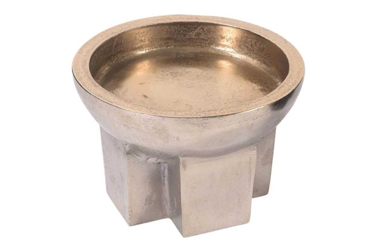 Den etwas anderen Kerzenhalter erhalten Sie bei uns. Dieses ausgefallene Dekoobjekt für Esstisch und Regal besteht aus Aluminium und wurde in einem schönen Bronze- und Goldtton gefärbt. Dank seines Durchmessers passen nicht nur eine, sondern gleich mehrere Teelichter hinein. Oder Sie stellen eine breite Stumpenkerze hinein.
