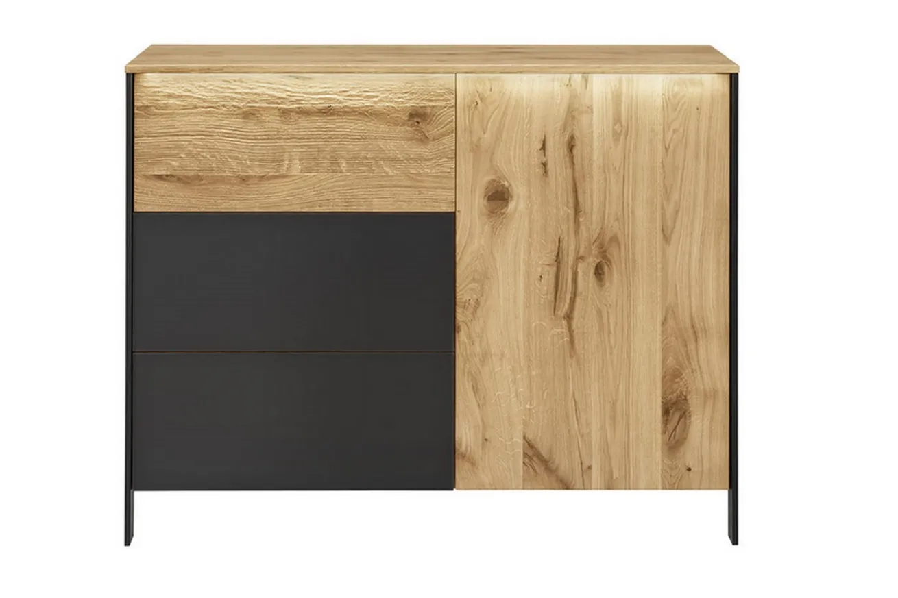 Wer auf den Mix aus Rustikalität und Moderne steht, kommt an Benni nicht vorbei. Die niedrige Wohnzimmerkommode, die hervorragend unter einen Fernseher passt, zeichnet sich durch sein Design aus. Das Möbelstück besteht zum größten Teil aus Holz der Wildeiche. Diese Sorte hat stark ausgeprägte Wuchsmerkmale wie Astlöcher, Harzkanäle und Jahresringe. Die Oberfläche des Holzes wurde jedoch geölt, so dass keine Verletzungsgefahr besteht. Das Flursideboard erstrahlt in der natürlich-warmen Farbe des Eichenholzes. Kombiniert mit den schwarzen Highlights, die aus einer Schublade und Füßen bestehen, wird daraus ein extravagantes Möbelstück, an dem man so schnell nicht seine Freude verliert. Doch die Konsole sieht nicht nur gut aus, sie hat auch ausreichend Stauraum für elektronische Geräte und Dekoobjekte jeglicher Art.