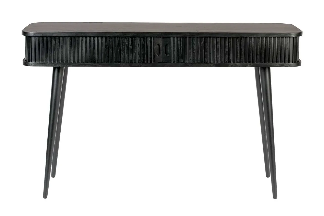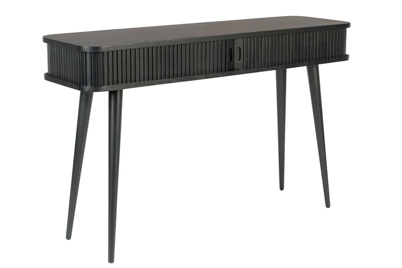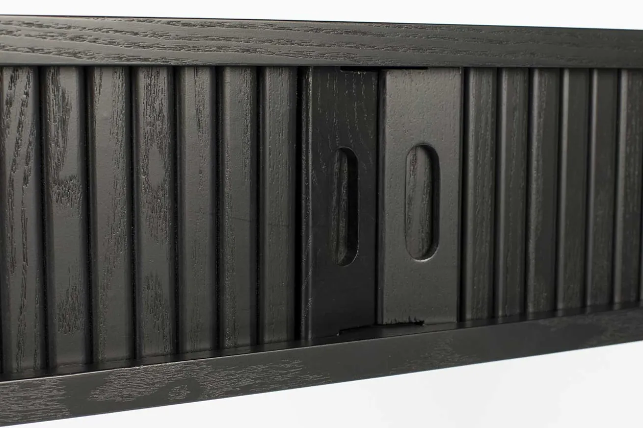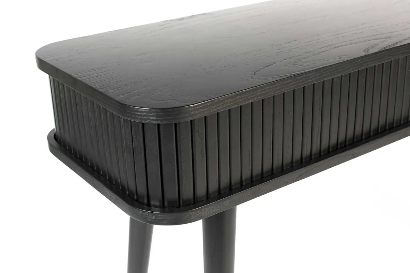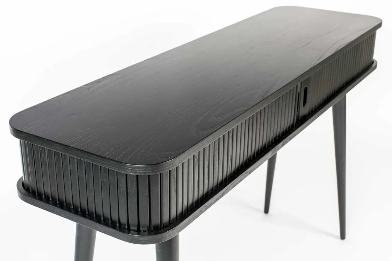 Die Konsole aus black oak hat einen 14,5 cm hohen Korpus und 59,5cm hohe Beine. Das Aussergewöhnliche an diesem Beisteller, ist die Lamellenfront, welche sich aufschieben lässt und somit Stauraum für Papier, Post, Laptop, Stifte und weiteren Kleinkram bietet. Für kleine Räume, Dielen oder Wohnungen ist dieses hochwertig gefertigte Möbel ideal.