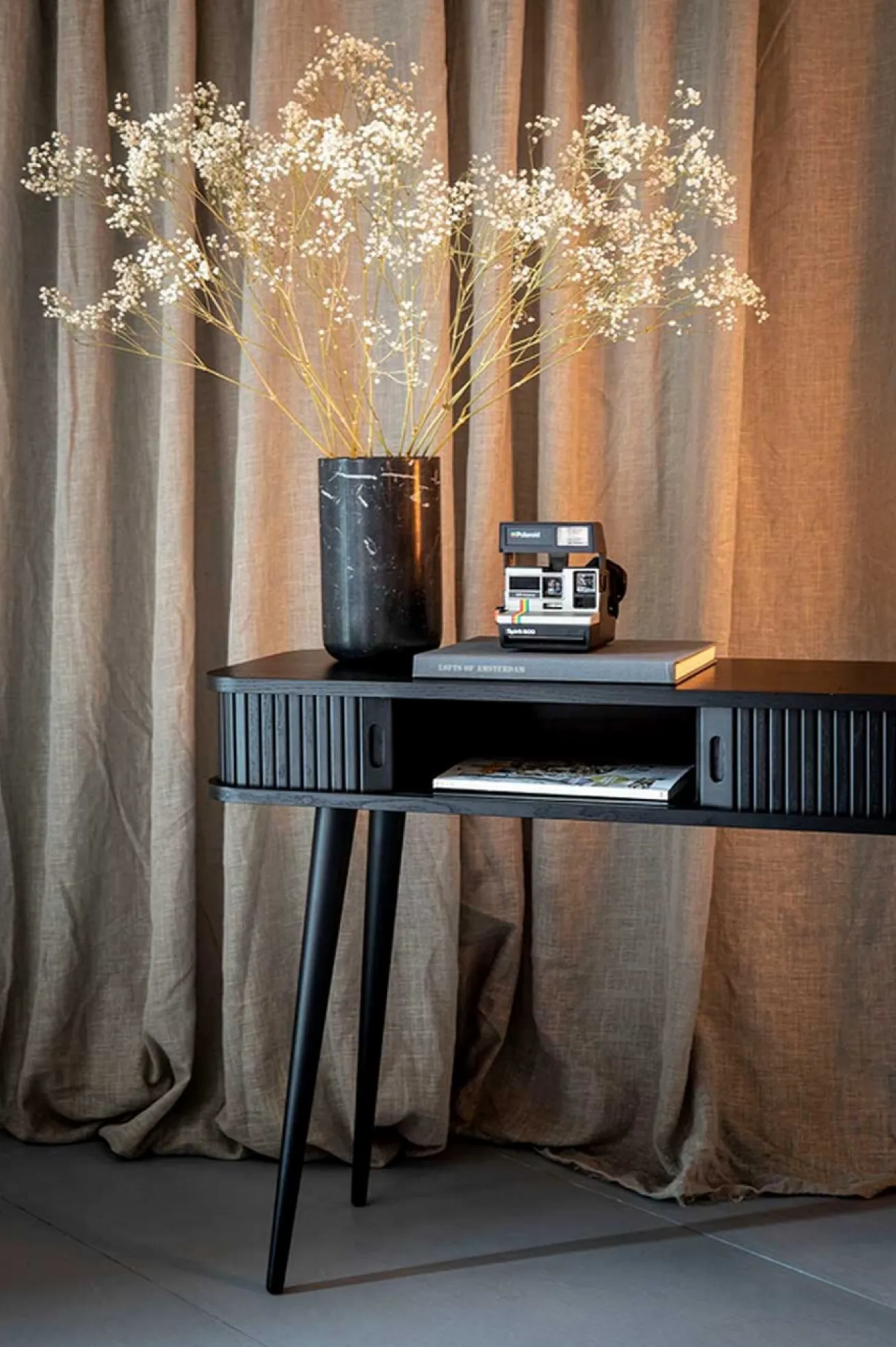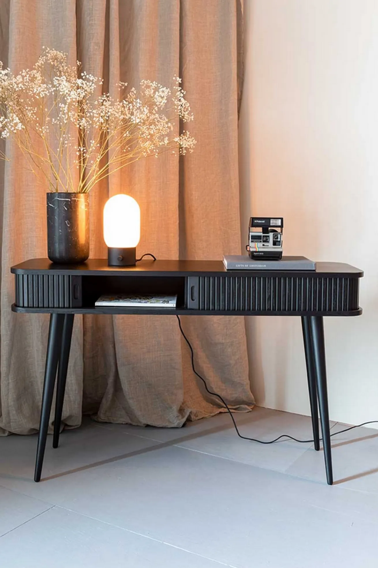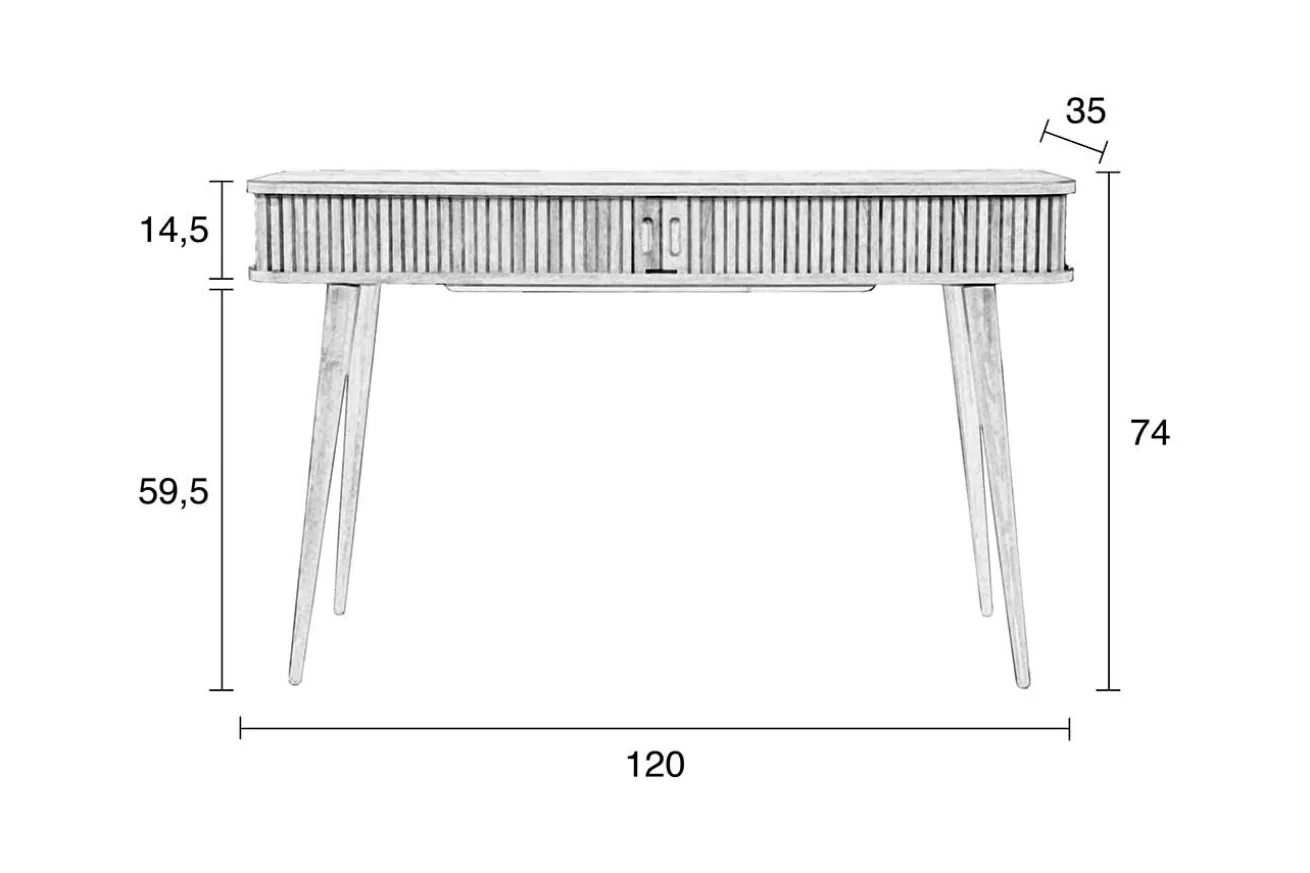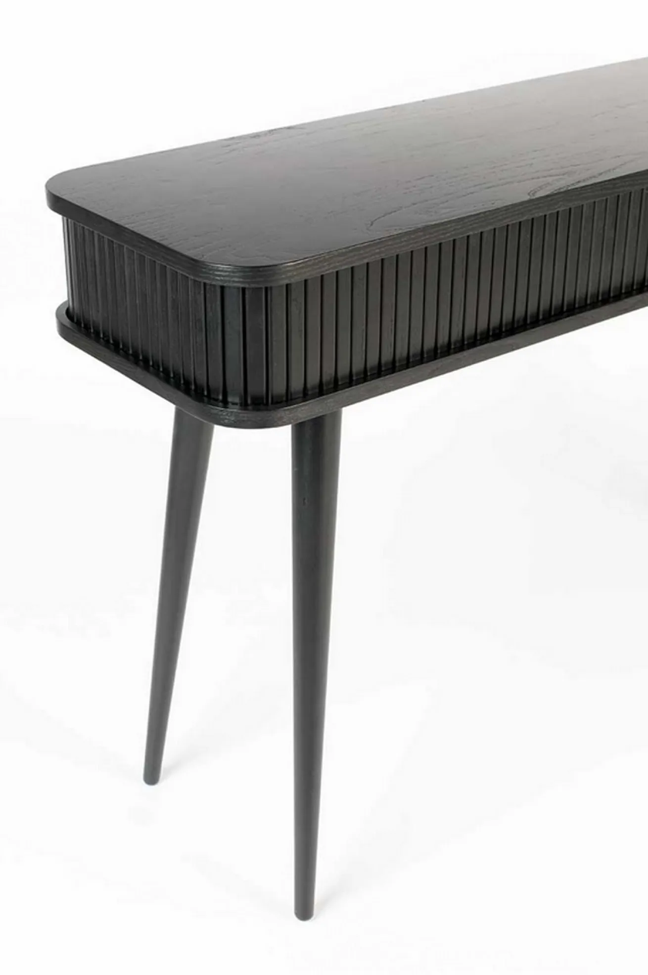 Die Konsole aus black oak hat einen 14,5 cm hohen Korpus und 59,5cm hohe Beine. Das Aussergewöhnliche an diesem Beisteller, ist die Lamellenfront, welche sich aufschieben lässt und somit Stauraum für Papier, Post, Laptop, Stifte und weiteren Kleinkram bietet. Für kleine Räume, Dielen oder Wohnungen ist dieses hochwertig gefertigte Möbel ideal.