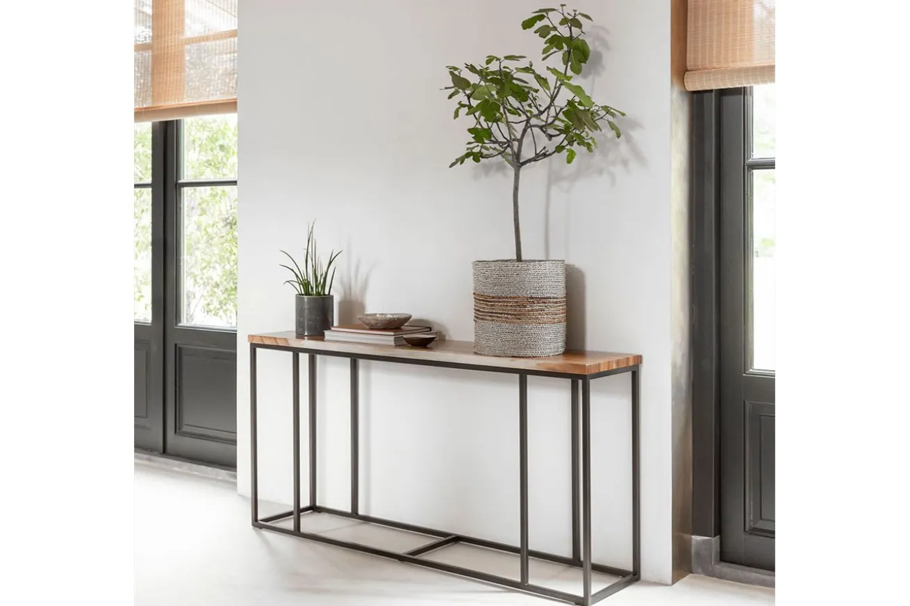 Betreten Sie die Welt zeitloser Eleganz und natürlicher Schönheit mit unserem faszinierenden Konsolentisch aus naturfarbenem Suarholz. Dieses Meisterwerk verbindet die warme Anziehungskraft des Suarholzes mit einer raffiniert lackierten Oberfläche und stabilen schwarzen Metallfüßen zu einem Statement-Stück, das Ihre Einrichtung auf ein neues Niveau hebt.
