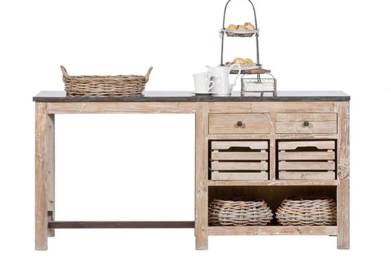 Holen Sie sich den Charme des Landhaus-Stils mit dem Luxus eines modernen Möbels auch auf die überdachte Terrasse. Der Küchenblock Montpellier aus leicht pigmentiertem recycletem Kiefernholz macht´s möglich. Eine schwere Steinplatte in dunklen schwarzgrauen Farbtönen sorgt für Aufsehen. In dem unteren rechten Teil dieses Küchenmöbels finden sich zwei Schubladen, zwei Aufbewahrungskörbe. Auf der Rückseite befinden sich zwei Türen. Ein Fachboden im Innern bietet viel Stauraum für Geschirr und Gläser. (nicht Winterfest, im Aussenbereich wird das Holz stärker Arbeiten, als im Innenbereich. Es können Spannungsrisse auftreten. Schubladen und Türen sollten in regelmäßigen Abständen überprüft und eingestellt werden)