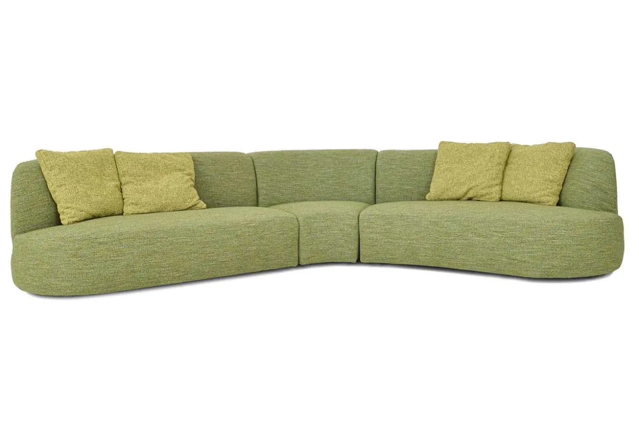 Das halbrunde, moderne Sofa besteht aus drei Teilen und lässt sich trotz seiner Größe problemlos von Raum zu Raum tragen. Immerhin hat es eine Breite von 330cm, eine Tiefe von 190cm und eine Höhe von 72cm. Durch die halbrunde Form lässt es sich nicht nur problemloser anlehnen, sondern auch auf der Couch versammeln. Der apfelgrüne Stoffbezug ist fest, nimmt dem Designersofa jedoch nicht seine Gemütlichkeit. Mit dem dazu passenden, runden Sofatisch erhalten sie ein ogranisches und wirklich einladendes Bild.