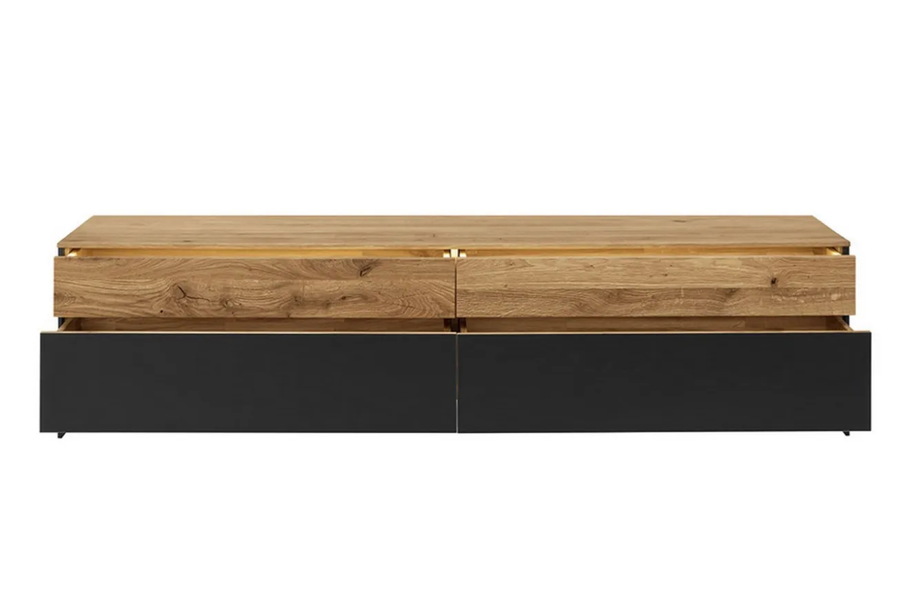 Wer auf den Mix aus Rustikalität und Moderne steht, kommt an Benni nicht vorbei. Die niedrige Wohnzimmerkommode, die hervorragend unter einen Fernseher passt, zeichnet sich durch sein Design aus. Das Möbelstück besteht zum größten Teil aus Holz der Wildeiche. Diese Sorte hat stark ausgeprägte Wuchsmerkmale wie Astlöcher, Harzkanäle und Jahresringe. Die Oberfläche des Holzes wurde jedoch geölt, so dass keine Verletzungsgefahr besteht. Das Flursideboard erstrahlt in der natürlich-warmen Farbe des Eichenholzes. Kombiniert mit den schwarzen Highlights, die aus einer Schublade und Füßen bestehen, wird daraus ein extravagantes Möbelstück, an dem man so schnell nicht seine Freude verliert. Doch die Konsole sieht nicht nur gut aus, sie hat auch ausreichend Stauraum für elektronische Geräte und Dekoobjekte jeglicher Art.