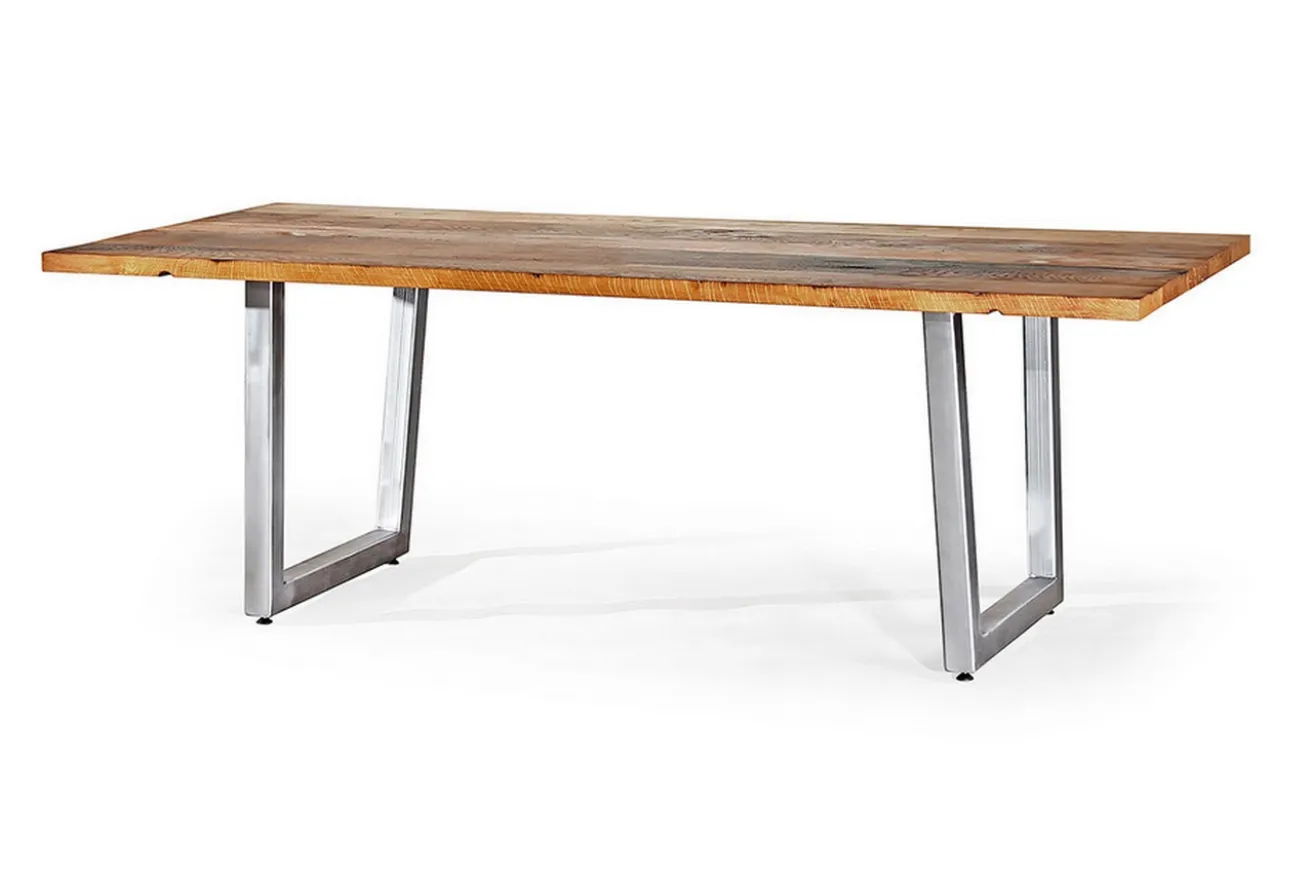 Charaktertisch auf Maß? Hier gehts! Bedingt durch das hohe Alter und der unterschiedlichen Umgebungen, aus denen die dicken Balken stammen, besitzt natürlich jede Oberfläche ihren ganz eigenen Charme und Charakter. Unser Esszimmertisch hat die Maße Breite 230cm, Tiefe 95cm, Höhe 78cm und eine Plattenstärke von 3-4cm. Er besteht aus recyceltem Scheunenholz, besser gesagt aus einzelnen Bohlen, die zusammengepresst diese unikate Tischplatte aus dem beliebten Möbelholz Eiche ergeben. Die Oberfläche wurde sowohl geölt als auch gewachst, geschliffen und die Äste ausgegossen. Der Tisch für sehr große Esszimmer behält auch durch die Oberflächenbearbeitung und seine eher modern aussehenden Beine seine Rustikalität bei. Obwohl die beiden Beine aus glänzendem Edelstahl sind, passt der Massivholztisch auch in Räumlichkeiten im Landhausstil.