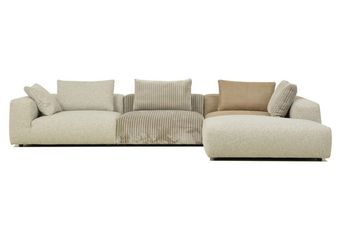 Das Design lebt vom spannenden Materialmix: Bouclé trifft auf Cord, feine Strukturen auf samtige Oberflächen – oder auf Wunsch auch auf hochwertiges Leder. Die großzügige Sitzfläche lädt zum Loungen ein, ohne überladen zu wirken.