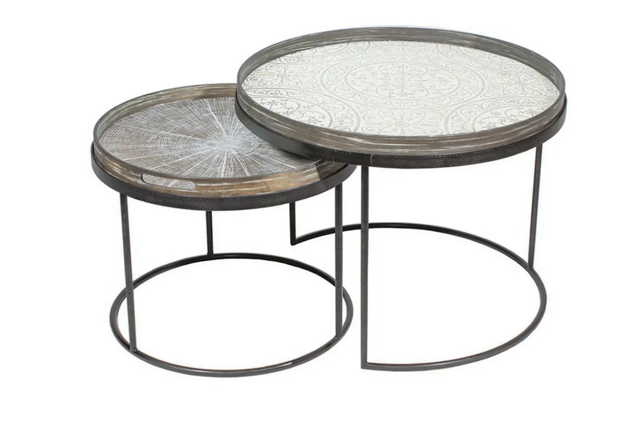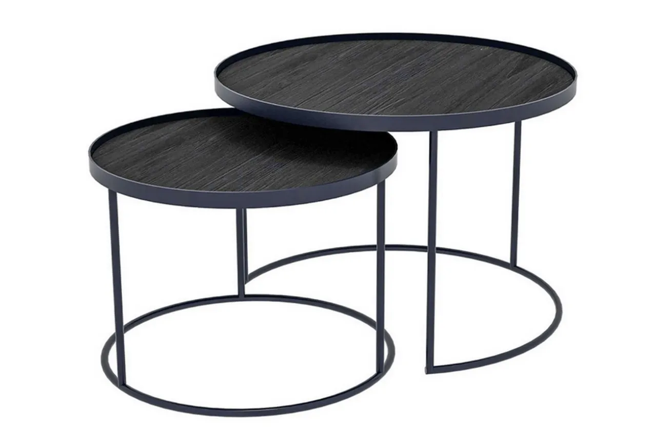 Das 2er-Set besteht aus den Gestellen für Tabletts der Firma Notre Monde. Das große Modell hat einen Durchmesser von 62cm und eine Höhe von 38cm, während das kleine einen Durchmesser von 49cm sowie eine Höhe von 31cm hat. Die beiden schwarzen Metallgestelle mit einer Holzoberfläche können entweder zusammen oder separat gestellt werden, egal in welchem Raum. Die Tische sind dazu konzipiert, um mit je einem Notre Monde Tablett vervollständigt zu werden.