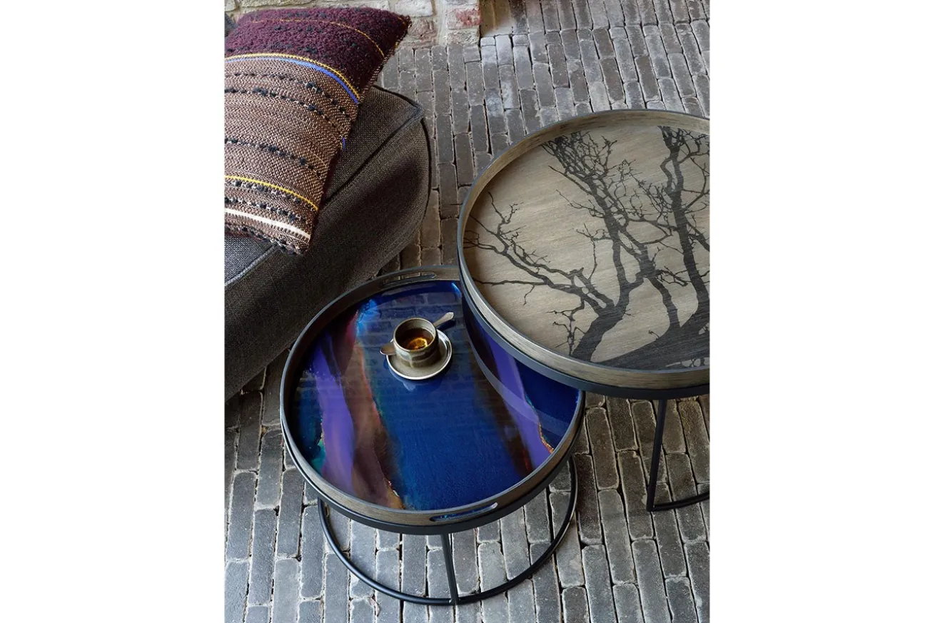 Gefertigt aus Holz, per Hand bemalt und siebbedruckt, ist jedes Stück ein Unikat. Die dezente Farbgebung in Braun und Schwarz fügt sich harmonisch in moderne wie klassische Wohnräume ein – ob allein platziert oder kombiniert mit einem passenden Notre Monde Tabletttisch-Gestell.