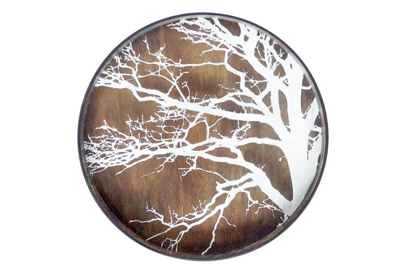 Das runde Serviertablett hat einen braunen Metallrahmen mit einer Höhe von 4cm, während der Durchmesser der Innenfläche 61cm beträgt. Eine Glasplatte auf der Innenfläche schützt das naturfarbene Bild, welches einen Baum mit Geäst darstellt.