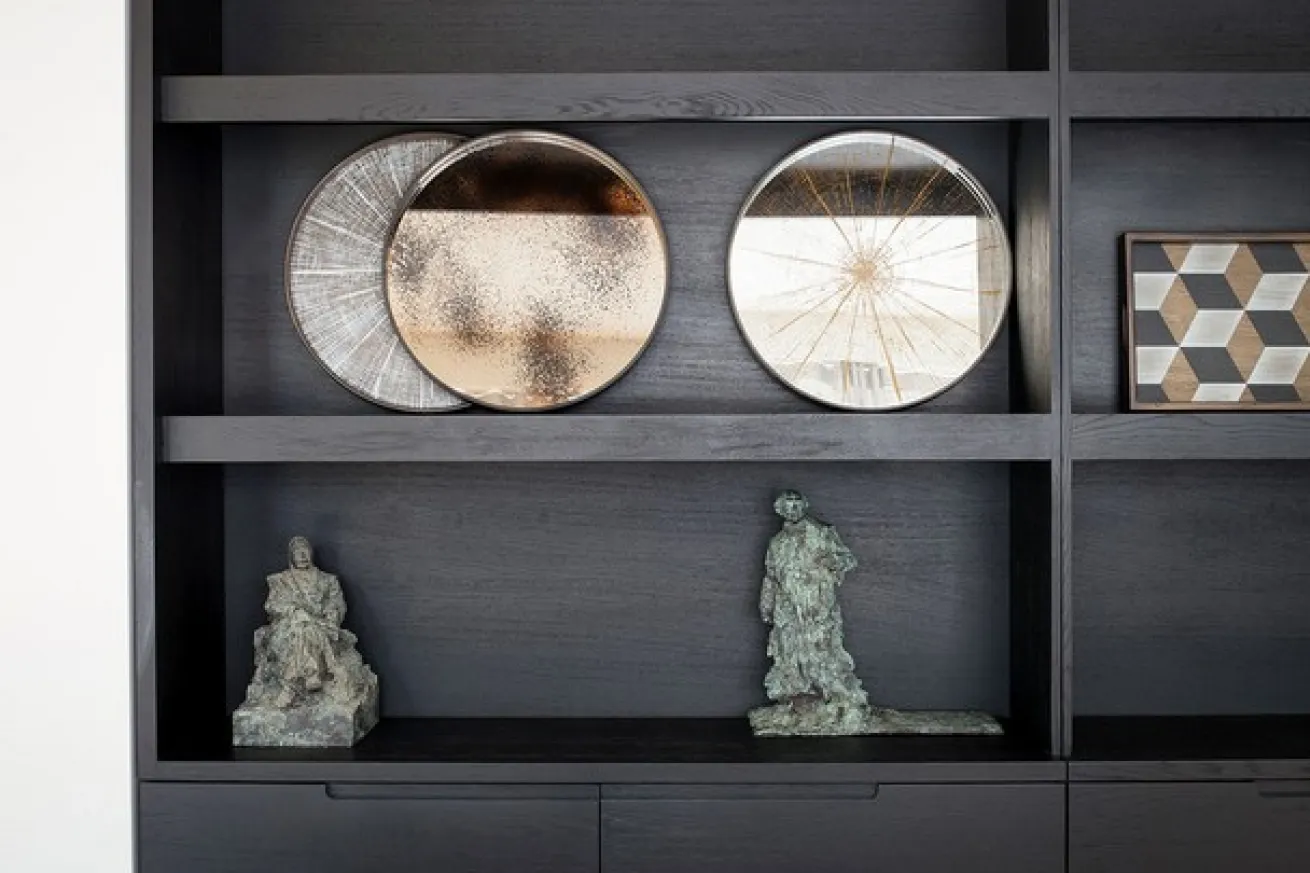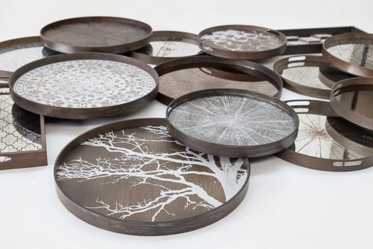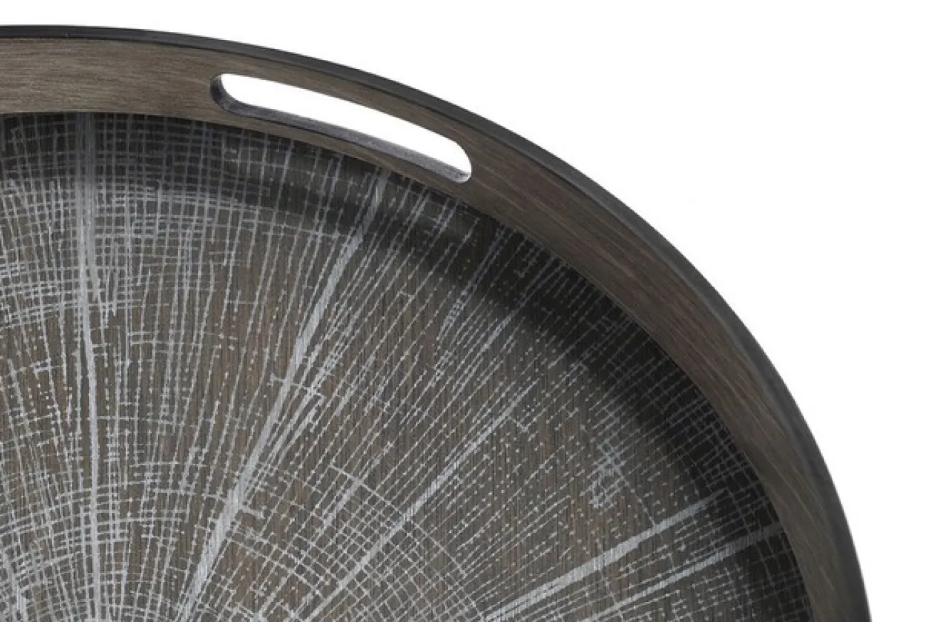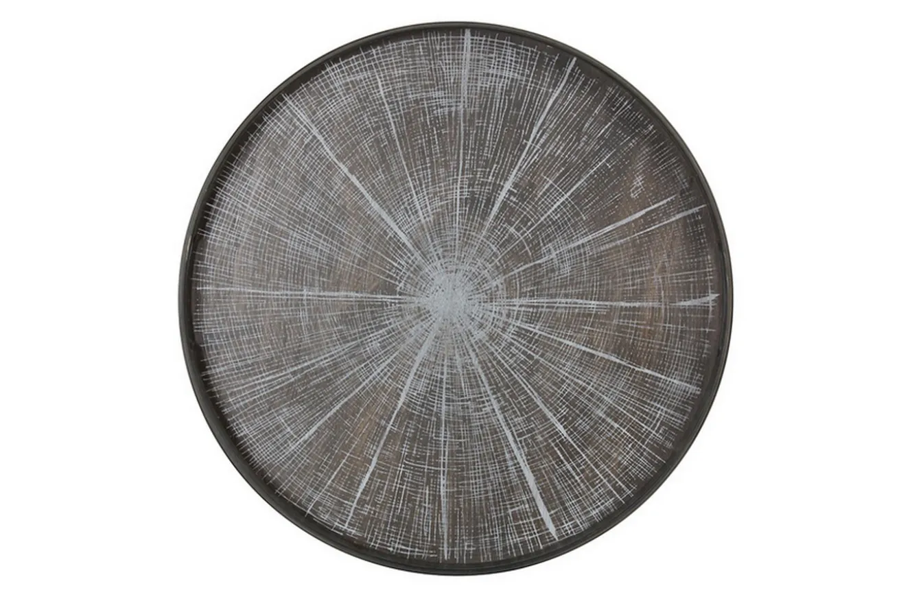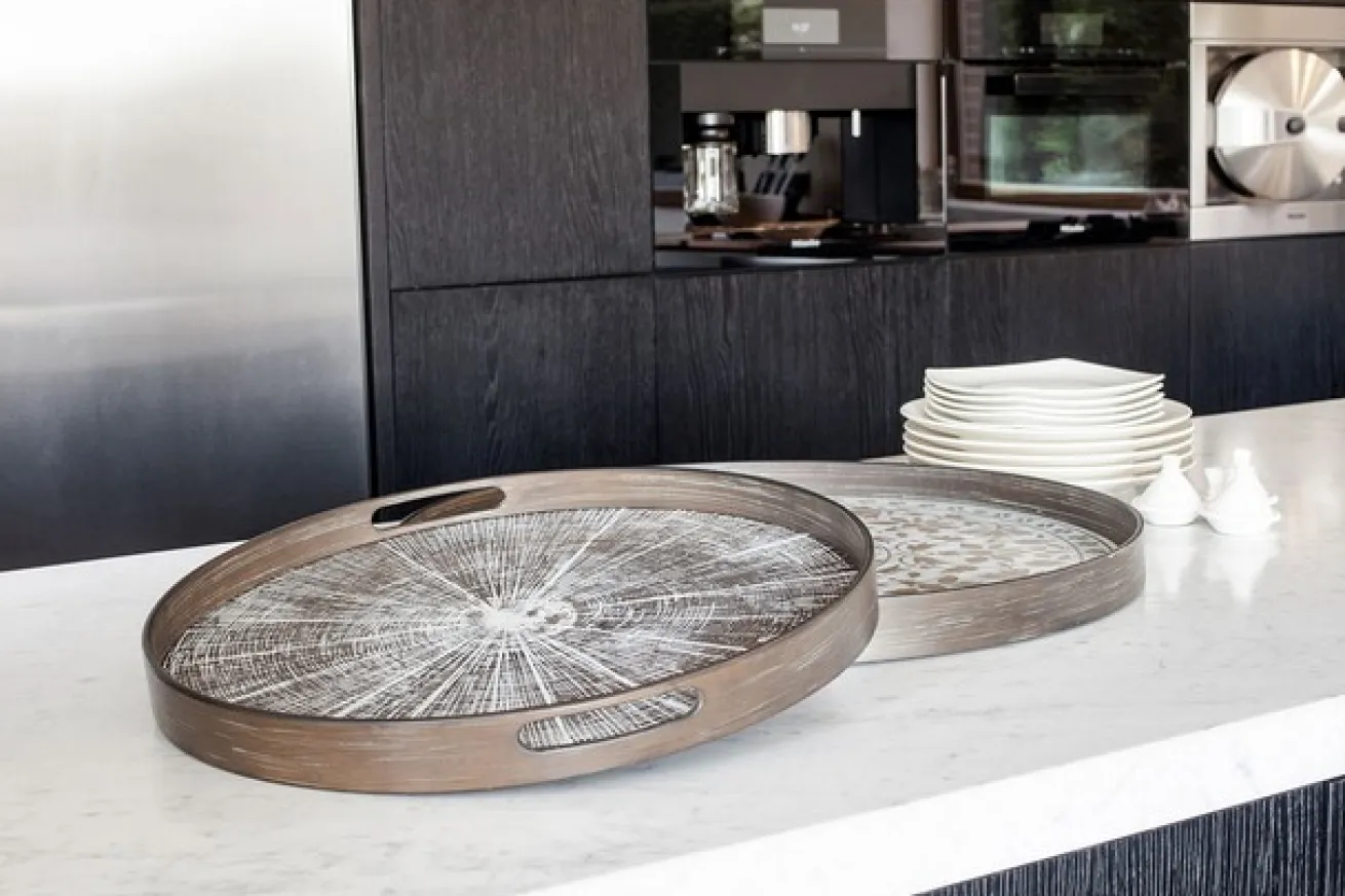 Bei diesem Accessoire handelt es sich um ein modernes und luxoriöses Tablett der Firma Notre Monde. Das modern und neutral gehaltene Design eignet sich ideal für jeden Raum und als Wanddekoration. Die Trays können perfekt als Auflageplatte für die dazugehörigen Notre Monde Gestelle genutzt werden oder kunstvoll Ihre Wände verschönern. Genauso gut kann es als dekoratives Serviertablett dienen. Dafür sorgt die Fläche mit einem Durchmesser von 48cm. Mit einem Rand von 4cm Höhe sollte auch nichts hinunterfallen. Jedes Tablett wurde handgefertig und ist somit ein Einzelstück.
