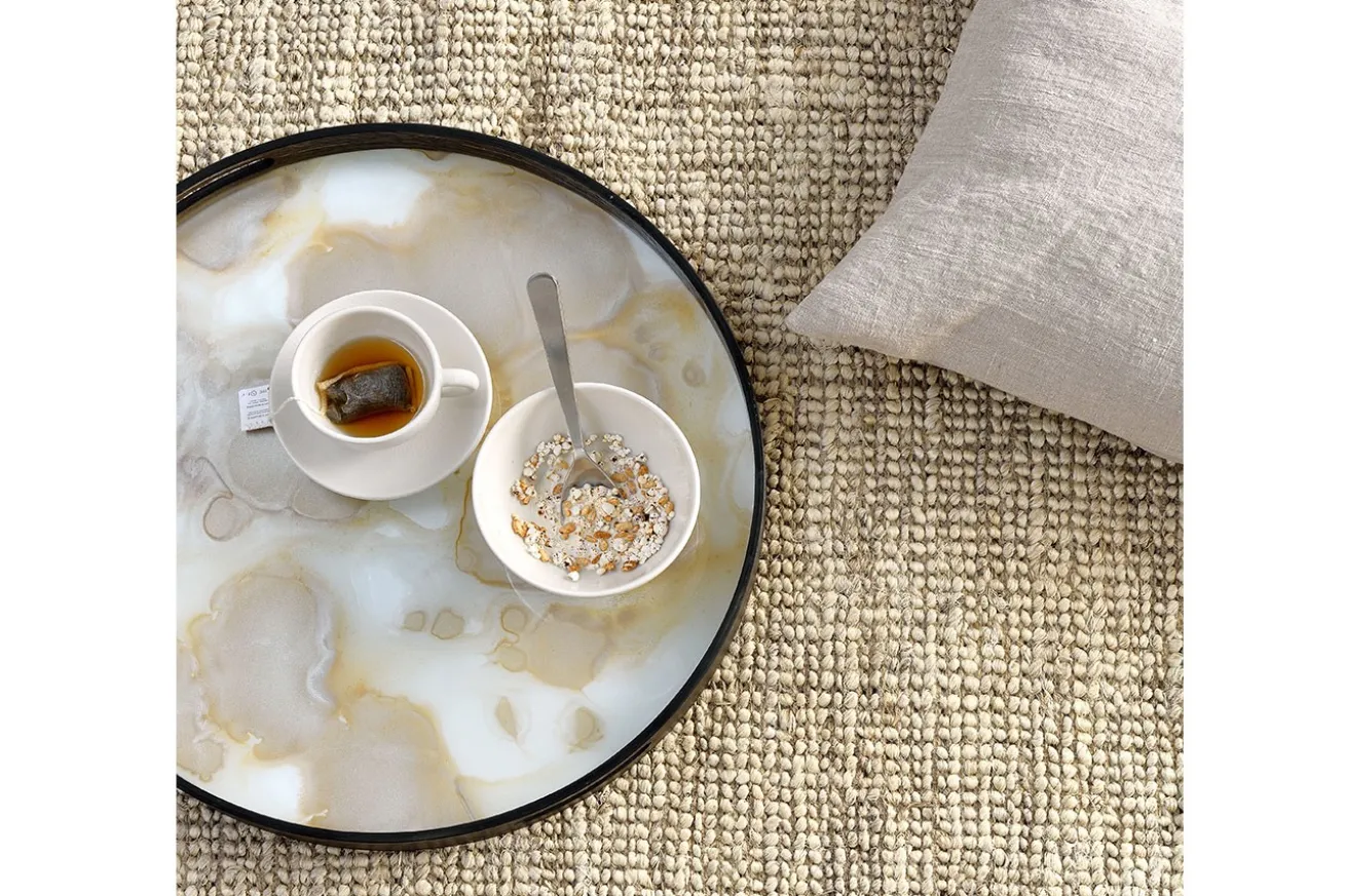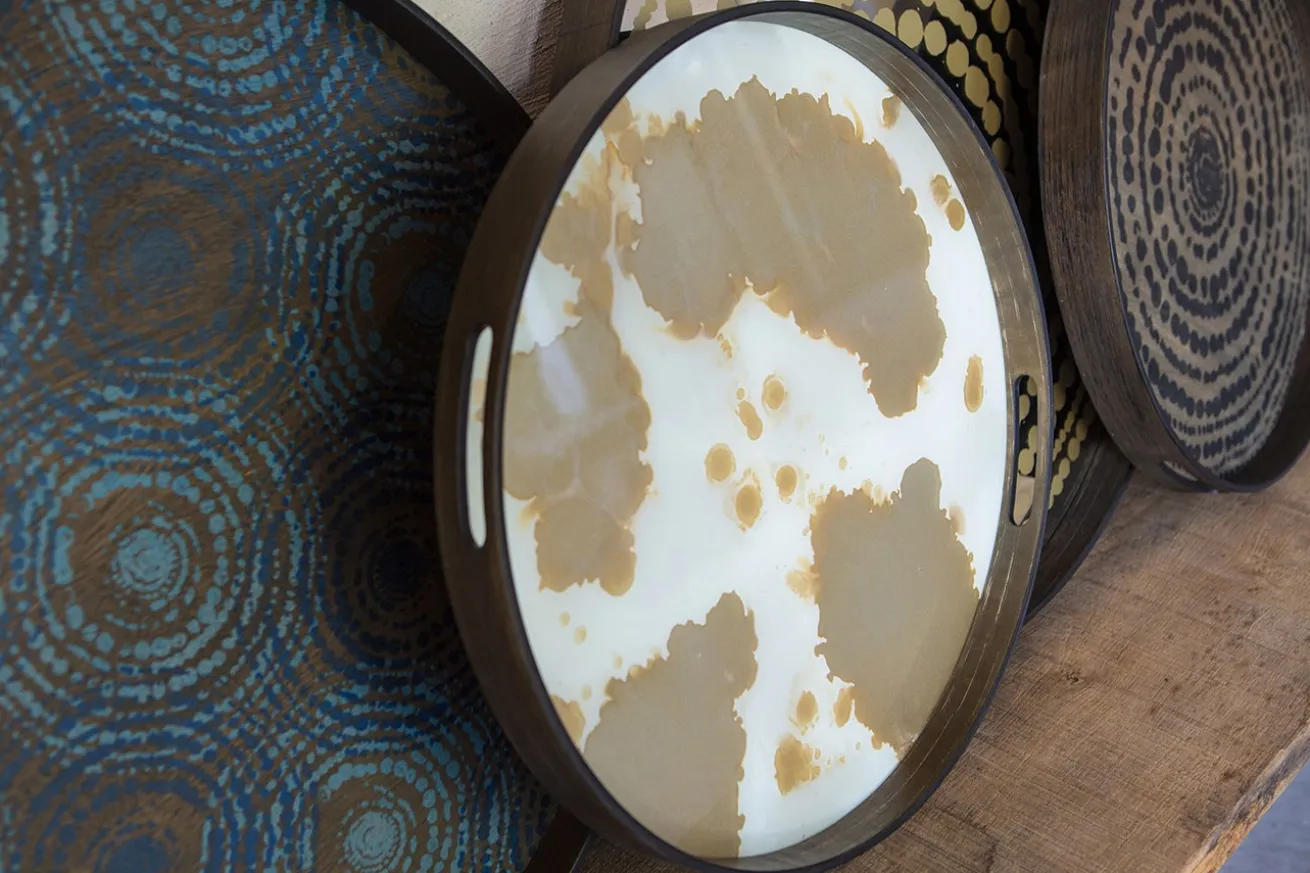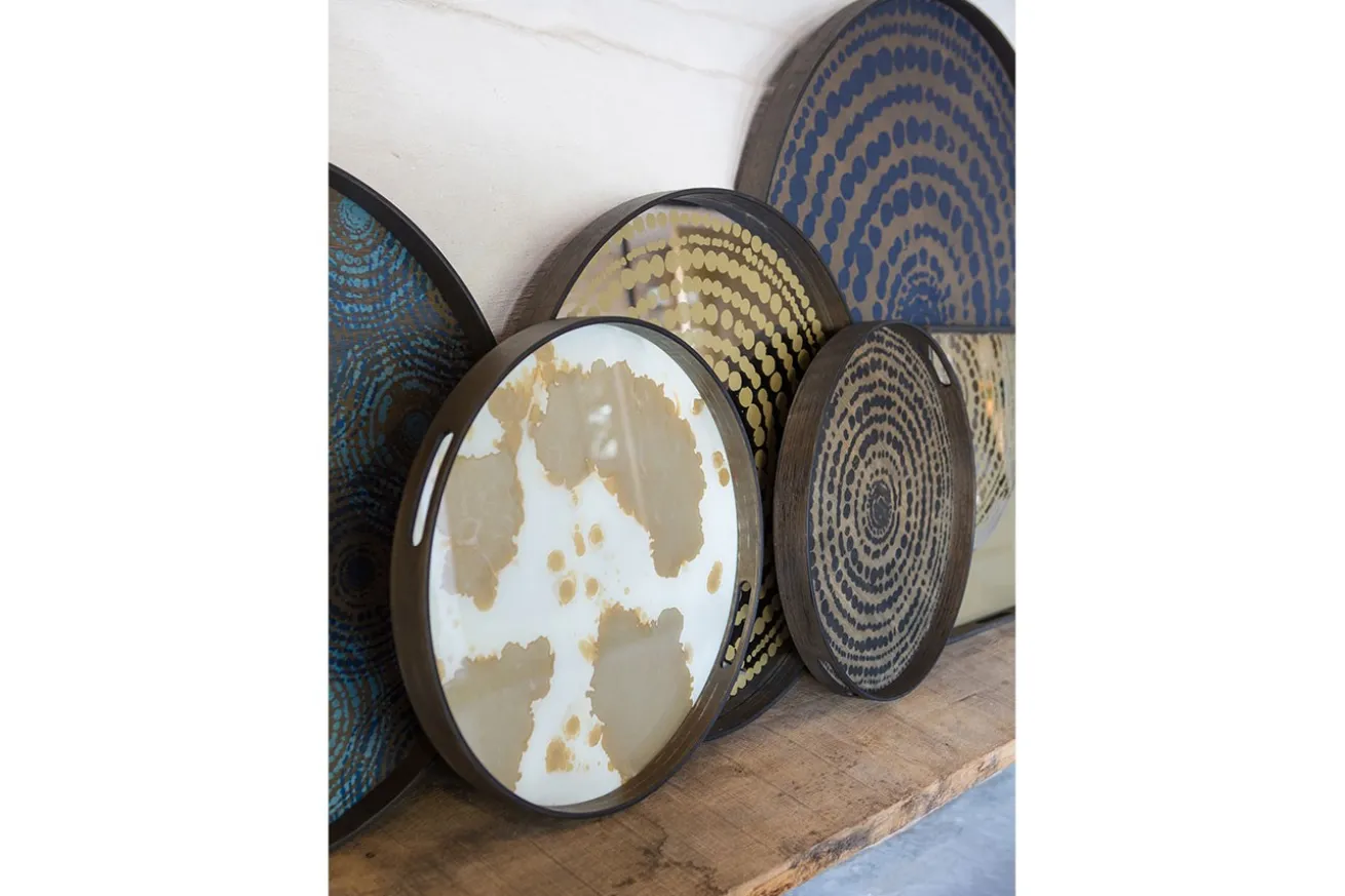 Die weiß-goldene Kreation, die als Unterlage für dekorative Artikel oder zum Transportieren von Getränken gedacht ist, lässt das Tablett mit einem Durchmesser von 48cm nobel und extravagant aussehen. Der 4cm hohe Holzrand mit Griffen eignet sich hervorragend für Ihre Einrichtungszwecke. Ob einzeln als Tablett oder in Kombination mit einem passenden Gestell als Tisch gefertigt, Ihnen bieten sich unendlich viele Verwendungsmöglichkeiten. Auch als dekoratives Bild, das Sie an die Wand lehnen, können Sie es einsetzen. Tun Sie sich keinen Zwang an und probieren Sie sich dekorationstechnisch aus. Dawn Sweitzer ist ein Künstlerin mit einem exklusivem Stilbewusstsein. Die Gründerin von NOTRE MONDE wird inspiriert auf ihren ausgedehnten Reisen auf der ganzen Welt und von den einfachen Dingen um sie herum. Sei es ein Lied, ein Buch, Mode, die Textur eines Gemäldes oder Menschen, die sie liebt, ihre Umgebung ist ihre Inspirationsquelle. Sie wählt Dinge aus, die direkt mit ihr sprechen und verleiht ihrer Arbeit Authentizität. Die Marke NOTRE MONDE ist ein direkter Ausdruck von Dawns Eintauchen in verschiedene Kulturen.