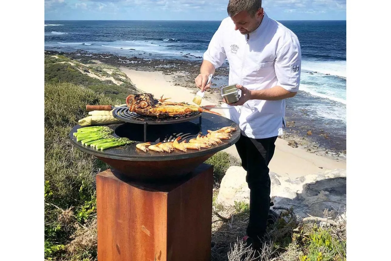 Dieser robuste zweiteilige Grillrost eignet sich ideal für die Zubereitung großer Fleischstücke auf der OFYR-Kocheinheit. Er ist aus schwarzem Stahl. Platzieren Sie den Grill und das Gestell direkt über der Flamme, damit sich die Röstaromen entfalten können. Die Kochplatte des OFYR bleibt dabei unversperrt. Dadurch können Sie gleichzeitig andere Gerichte kochen. Die Erhöhung des Gestells ermöglicht das einfache Hinzufügen von zusätzlichem Feuerholz.
