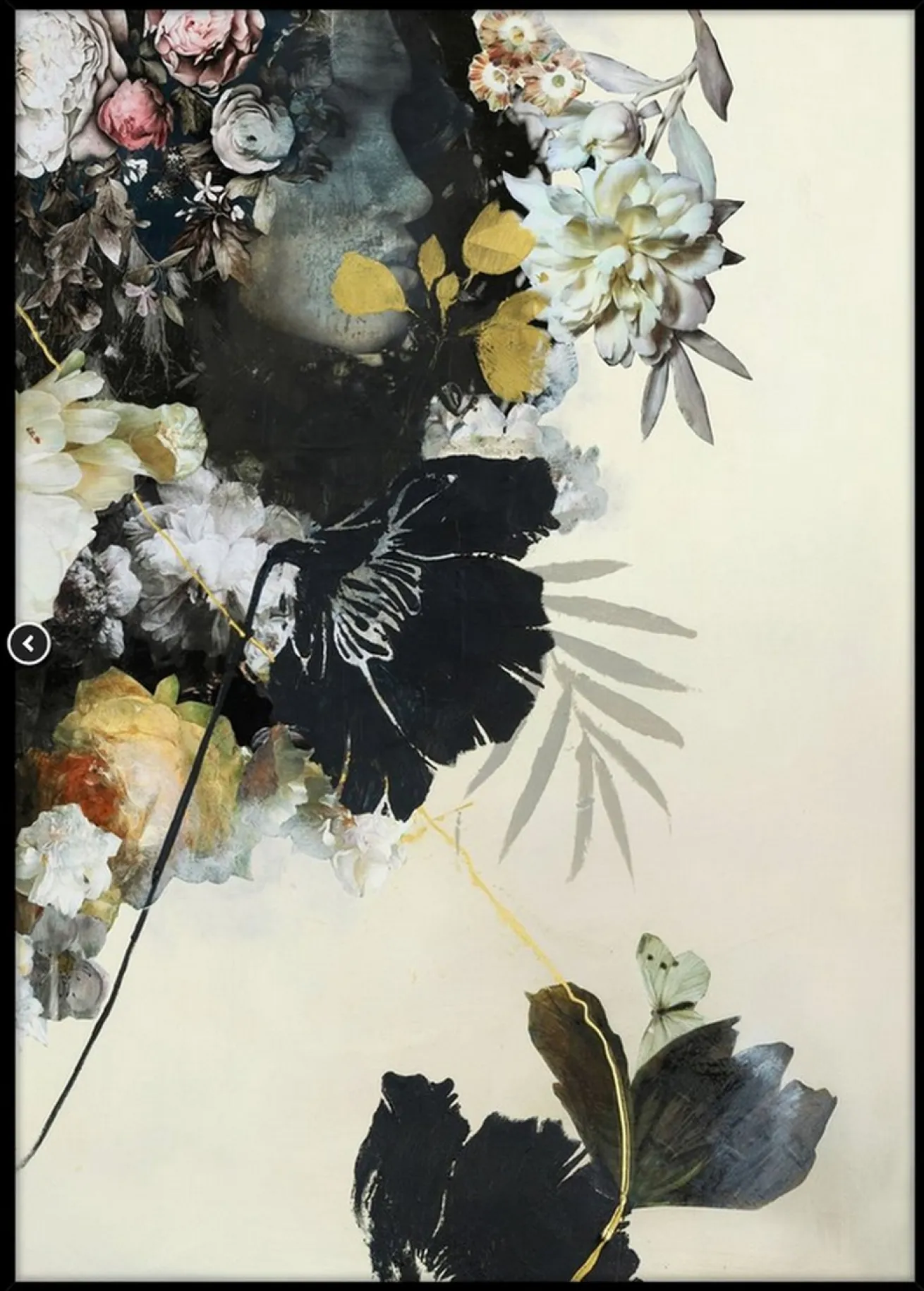 Dieses gerahmte Poster ist ein Druck und stellt ein in schlichten Farben gehaltenes Blumenarrangement dar, welches sich von oben links in die Mitte erstreckt und von unten rechts ebenfalls abgebildet ist. Der Druck hat eine Höhe von 100cm, eine Breite von 70cm und eine Tiefe von 2cm. Er wird von einem schwarzen Rahmen eingerahmt und ist perfekt für alle modernen Milieus geeignet.