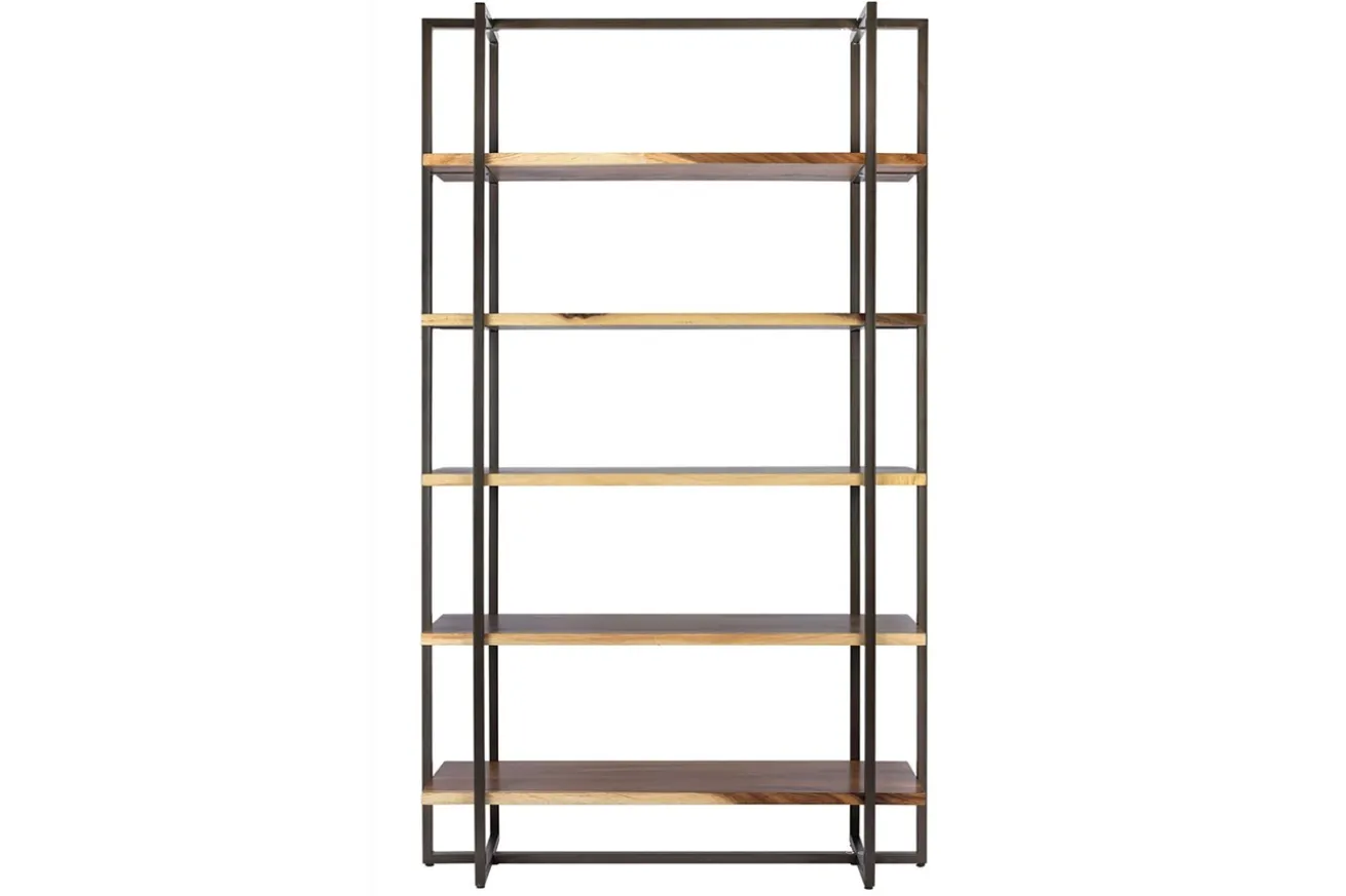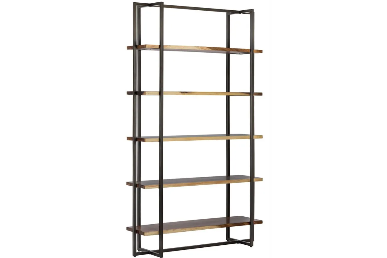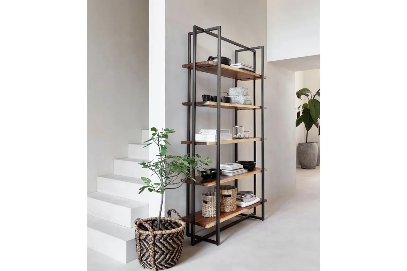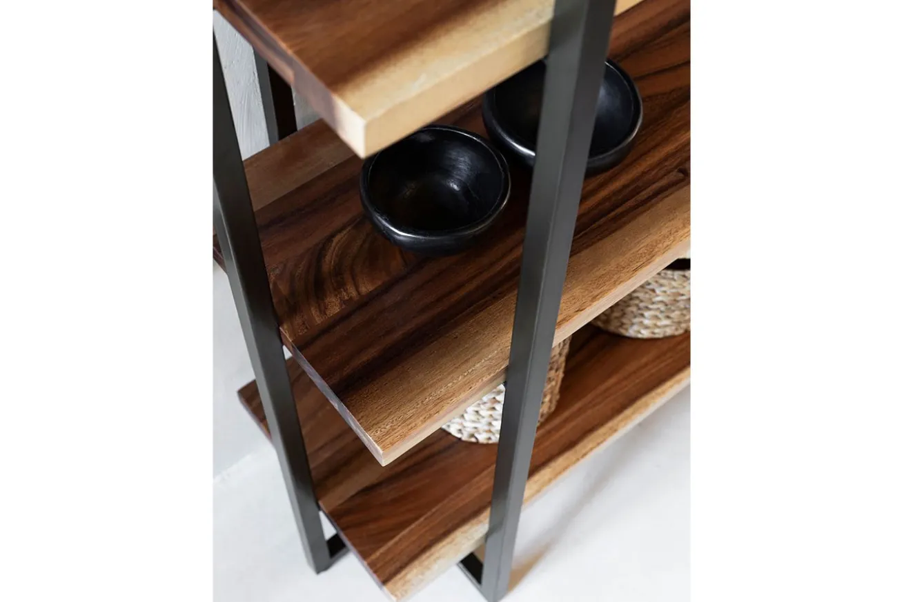 Die schwarzen Metallfüße verleihen dem Regal eine moderne Note und bieten gleichzeitig Stabilität und Langlebigkeit. Die klaren Linien des Gestells bilden einen kraftvollen Kontrast zur organischen Textur des Suarholzes, wodurch ein harmonisches Gleichgewicht zwischen Natur und Industrie entsteht.