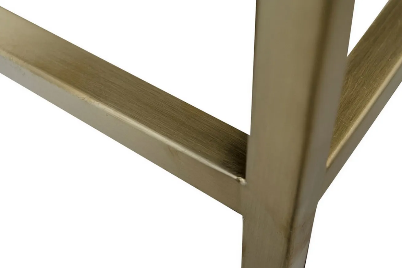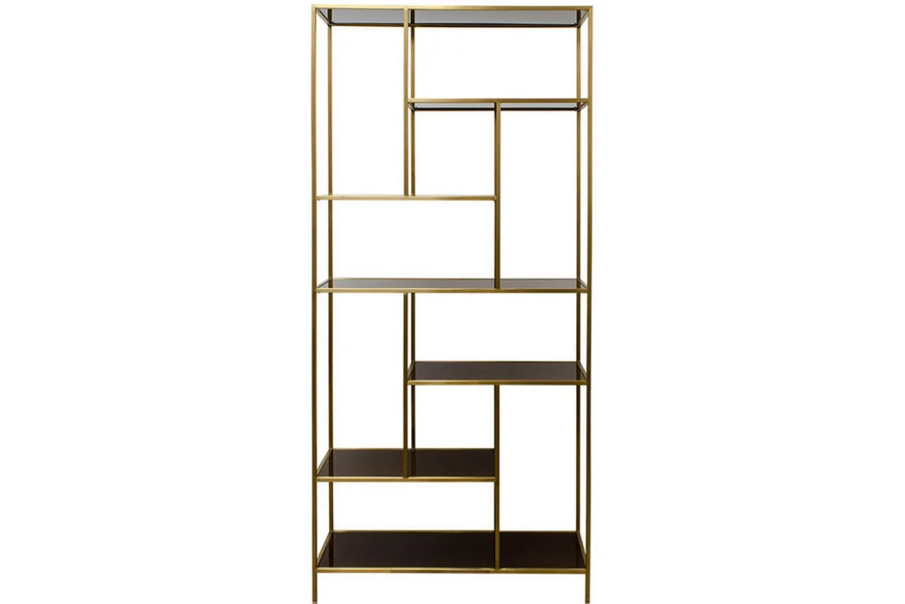 Das Wandregal Lloyd wurde im Art Deco Stil kreiert und besteht aus unterschiedlichen Komponenten, die ihn zum anschaulichsten Standregal in Ihrem Zuhause oder Unternehmen machen. Das Gestell ist aus Edelstahl und wurde in einem antiken Goldton lackiert. Die bereits vorgefertigten Lücken für Bücher, Taschen, Ordner oder aber Köstlichkeiten der hauseigenen Konditorei haben aus dunklem Glas bestehende Einlegeböden. Mit einer Höhe von 210cm, einer Breite von 98cm und einer Tiefe von 35cm eignet sich das Produkt auch hervorragend als Raumteiler, denn da das Regal ohne Wandrücken freisteht, können Sie von beiden Seiten auf die im Regal stehenden Gegenstände greifen.