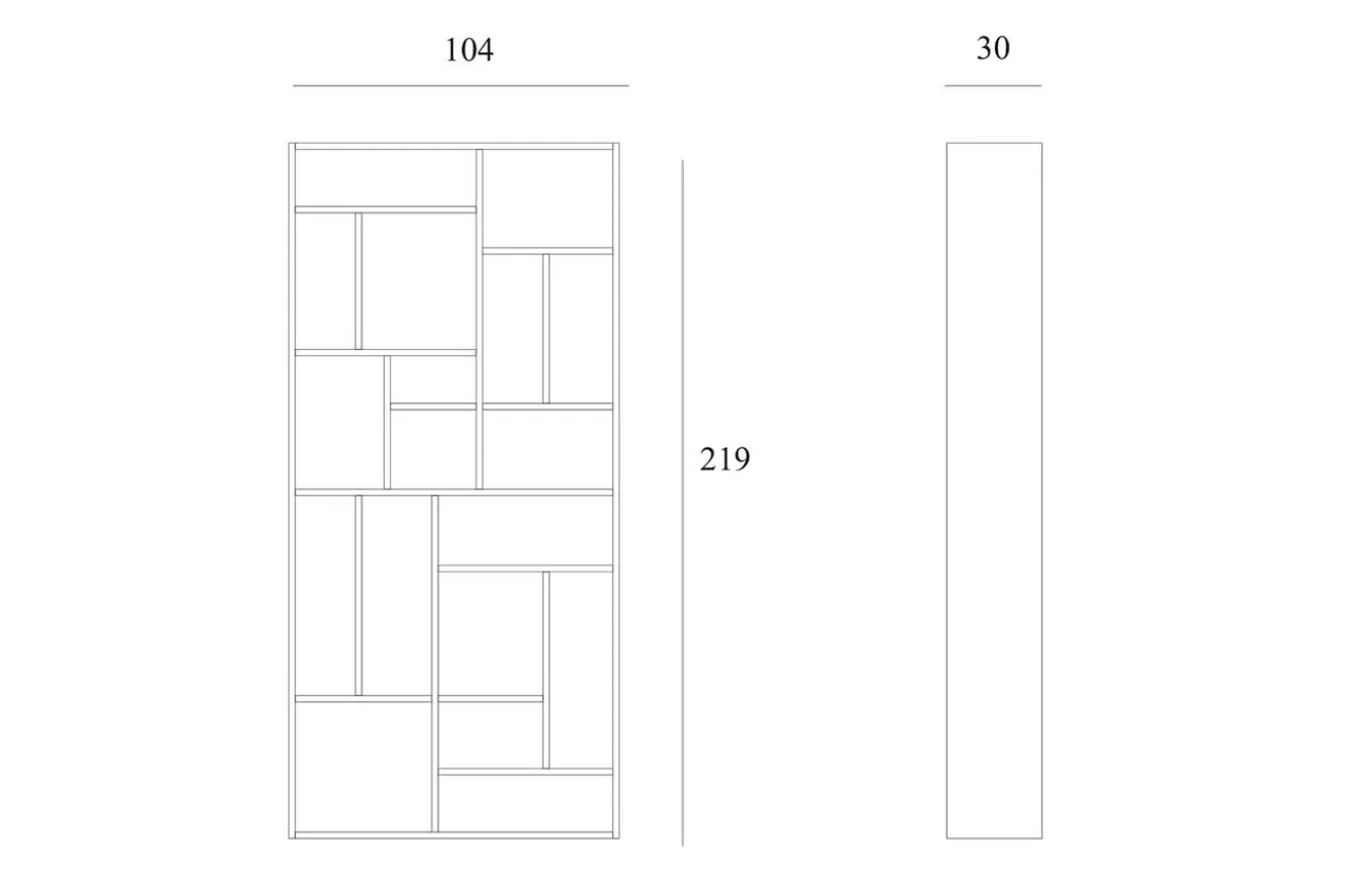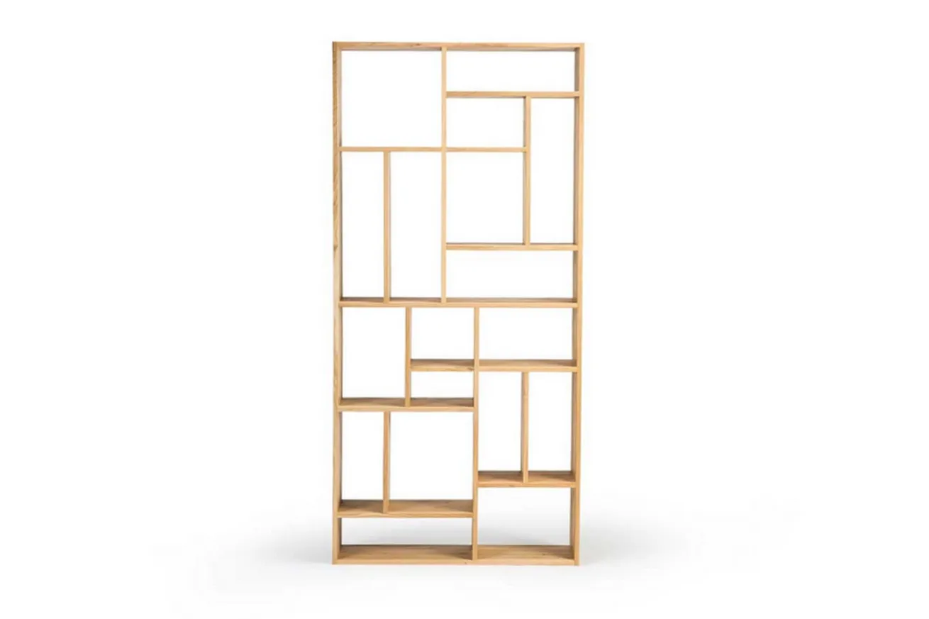 Jenes Regal aus massivem Eichenholz erstrahlt in seiner natürlich warmen Farbe und bringt gleich 17 vorgefertigte Nischen für Bücher, Lampen, Vasen und andere Wohnaccessoires mit. Mit einer Höhe von 219cm, einer Breite von 104cm und einer Tiefe von 30cm können Sie noch mehr Dinge hineinstellen, die Sie zuhause finden und die eine neue Bleibe benötigen. Ob es Ihre Lieblingsbücher sind oder aber die neusten Beautyprodukte in Ihrem Ankleide- und Schminkzimmer stilvoll präsentiert werden sollen, mit diesem Regal ist alles möglich. Vor allem, weil die vorgefertigten Nischen nicht einheitlich, sondern nach Belieben eingeteilt wurden, wodurch Sie Ihrer Fantasie freien Lauf lassen können.