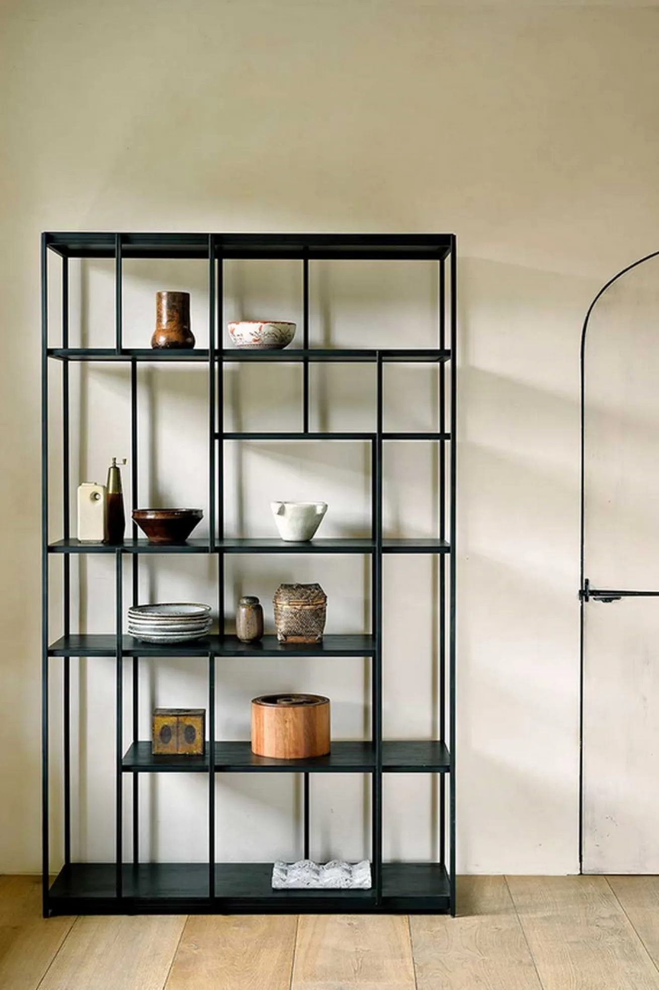 Alle kreativen Köpfe, die gerne mit Farbe arbeiten, benötigen Möbel, die sie erden und ihren Räumlichkeiten Ruhe verleihen. Deshalb ist „Studio“, unser Regal aus Teakholz, perfekt dafür geeignet. Das 205cm hohe, 120cm breite und 40cm tiefe Möbelstück, welches schwarz lackiert und geölt wurde, bietet Ihnen genügend Stauraum für Acrylfarben, Bücher über Kunst und dekorative Topfpflanzen, die gerne auch runterhängen können. Typisch für dieses Standregal sind die klaren Linien und die bereits vorgefertigten Fächer, die Ihnen dennoch erlauben, sich nach Lust und Laune auszutoben, wenn es um das Eindekorieren geht. Lassen Sie Ihrer Kreativität also freien Lauf, egal ob Sie es nun ins Wohnzimmer im Boho-Stil stellen, oder in Ihr Atelier.