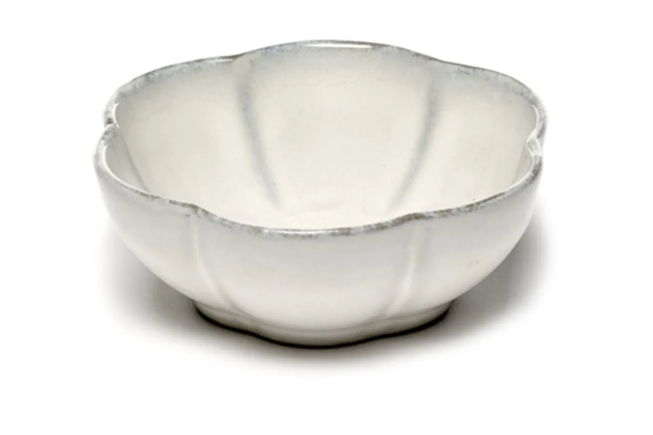 Diese blumenförmige Schale mit einem Durchmesser von 11cm sowie einer Höhe von 4cm eignet sich für Dips, aber auch für die morgendliche Portion Porridge. Die aus weißem Steingut und gräulichem Rand gefertigte Schüssel ist jedoch so außergewöhnlich, dass Sie sie auch nur zu besonderen Anlässen rausholen dürfen. Alles kann, nichts muss. Komplettiert mit anderen Geschirrteilen der Inku-Kollektion in Blumenform kreieren Sie so auf jedem Tisch ein natürlich schönes Ambiente.