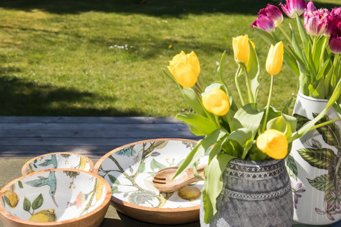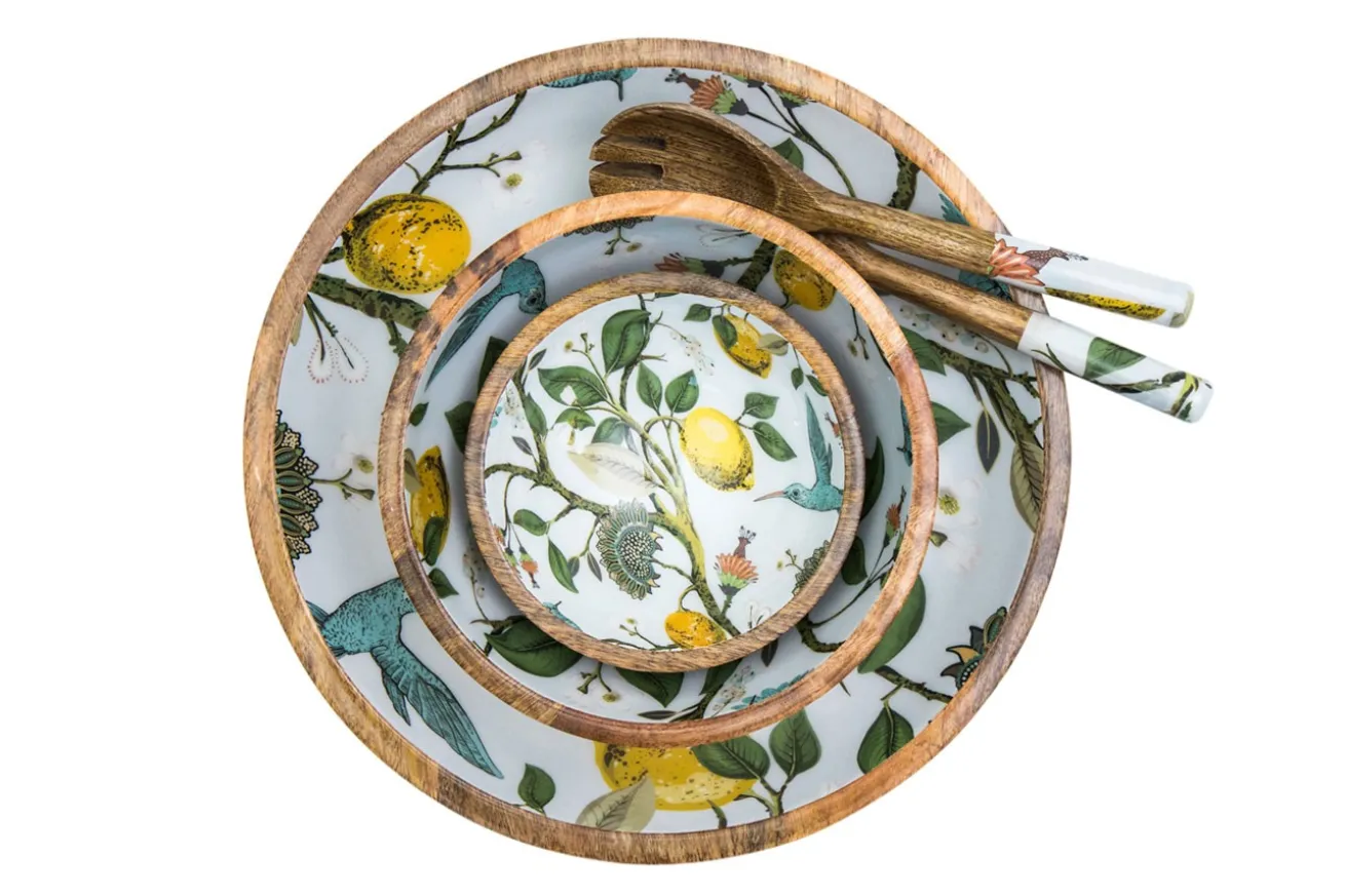 Als Dekoration im Flur, zur Aufbewahrung von Obst oder zum Anrichten von leckeren Bowls eignet sich diese 38cm große Schüssel aus Mangoholz allemal. Das Geschirrstück, das innen aus Kunstharz besteht und mit einem fröhlichen bunten Muster ausgearbeitet wurde, sorgt bereits beim Anblick für gute Laune. Mit anderen Artikeln aus der „Lemon Bird“-Serie können Sie einen farbenfroh gedeckten Tisch kreieren, der nicht nur einladend wirkt, sondern auch Ihre Gäste begeistert.