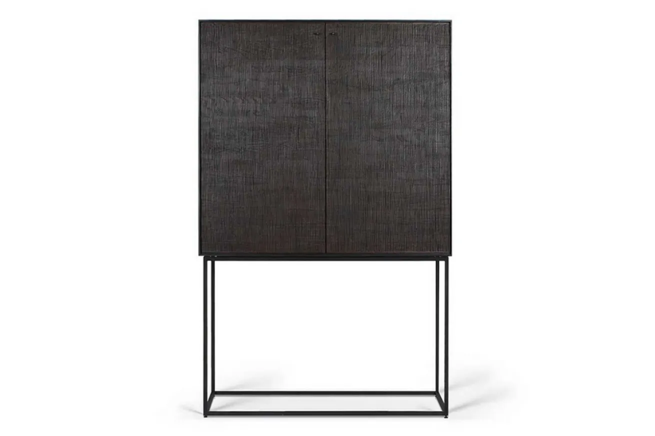 Dieser dunkel getönte Schrank aus Teak strahlt durch seine Farbe ein elegantes Design aus. Vor allem die handgeschnitzten Linien und kleinen Unebenheiten unterstreichen den Charakter des Möbelstücks und machen dieses zu etwas Einzigartigem. Der 162cm hohe Schrank hat zwei Türen, hinter denen sich sowohl Einlegeböden als auch Schubladen befinden, die zum Verstauen von allerlei Gegenständen dienen. Die dunkle Farbe lässt den Teakschrank zeitlos, gleichzeitig aber auch stilvoll und modern aussehen. Egal, in welchen Raum Sie ihn stellen, dank des dünnen Gestells wirkt das Möbelstück leicht und macht keinesfalls den Eindruck, als lasse er die Räumlichkeit kleiner erscheinen.